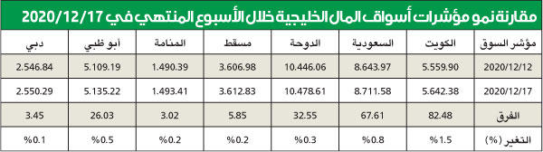 اكتفى مؤشر سوق قطر المالي بنمو بثلث نقطة مئوية وبعد أسبوع أيضاً من جني الأرباح، وأقفل قريباً من أعلى مستوياته هذا العام إذ جمع 32.55 نقطة ليقفل على مستوى 10478.61 نقطة، وتعادل مؤشرا سوقي "مسقط" و"المنامة" بنمو بعُشري نقطة مئوية، إذ أضاف مؤشر سوق عمان 5.85 نقاط ليقفل على مستوى 3612.83 نقطة بينما ربح مؤشر سوق البحرين المالي 3.02 نقاط ليقفل على مستوى 1493.41 نقطة في طريقه للوصول إلى مستوى 1500 نقطة.واكتفى مؤشر سوق دبي المالي بعد "رالي" من المكاسب الأسبوعية بعُشر نقطة مئوية فقط وبعد حالة من التذبذب انتهت بإيجابية بارتفاع ب 3.45 نقاط ليقفل على مستوى 2550.29 نقطة بانتظار تدفق تقديرات الأرباح والخسائر لعام استثنائي على الشركات في دبي وبقية دول العالم.