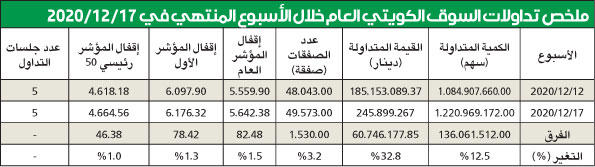 تغير حال بورصة الكويت خلال الدقائق الأخيرة من الأسبوع، وتم الدخول على الأسهم القيادية بقوة لتتغير المكاسب وتنمو بقوة لينتهي الأسبوع بمكاسب بلغت 1.5 في المئة لمؤشر السوق العام إذ ربح 82.48 نقطة مقفلاً على حدود 5641.38 نقطة، بينما سجل مؤشر السوق الأول ارتفاعاً بنسبة 1.3 في المئة هي 78.42 نقطة جميعها تمت في الجلسة الأخيرة ليقفل على مستوى 6176.32 نقطة، وربح مؤشر السوق "رئيسي 50" نسبة 1 في المئة تعادل 46.38 نقطة ليقفل على مستوى 4664.56 نقطة.وارتفعت متغيرات السوق الرئيسية الثلاثة (الكمية والقيمة والسيولة) مقارنة مع الأسبوع السابق ونما النشاط بنسبة 12.5 في المئة بينما رفع دخول السيولة خلال فترة المزاد بنهاية الأسبوع السيولة بنسبة 32.8 في المئة، وارتفع عدد الصفقات بنسبة 3.2 في المئة، وكانت السيولة مركزة على الأسهم القيادية بنهاية الجلسة خصوصاً "الوطني" ثم "زين" و"بيتك" و"بوبيان"، بينما كانت تتوزع خلال بداية الأسبوع على مجموعة أسهم تشغيلية في السوق الرئيسي، وتبقى تنتظر أسبوعين مهمين لتحديد الأرباح والخسائر لعام صعب.مكاسب وسط