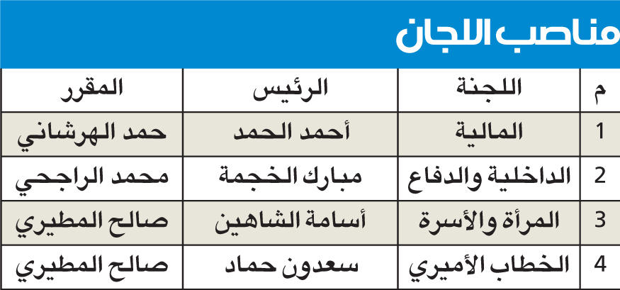 وعلى صعيد مناصب اللجان، أعلن النائب أحمد الحمد عقد اللجنة المالية اجتماعها الأول لاختيار رئيسها ومقررها، مشيراً إلى أنه تمت تزكيته لرئاسة اللجنة والنائب حمد الهرشاني مقرراً لها، وسط تفاهم كبير من أعضائها ومكتبها الفني.وأعرب الحمد عن تطلعه لإنجاز القوانين التي تأتي في مصلحة الوطن والمواطن خلال الفترة القادمة، "واضعين نصب أعيننا تحقيق طموحات الشعب الكويتي على هذا الصعيد".