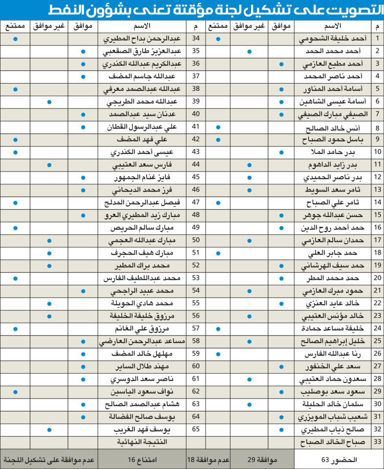 رفض المجلس تشكيل لجنة شؤون النفط، حيث شارك في التصويت 63 عضواً وجاءت النتيجة بموافقة 29 ورفض 18 وامتناع 16 عضواً ضمنهم الأصوات الحكومية.