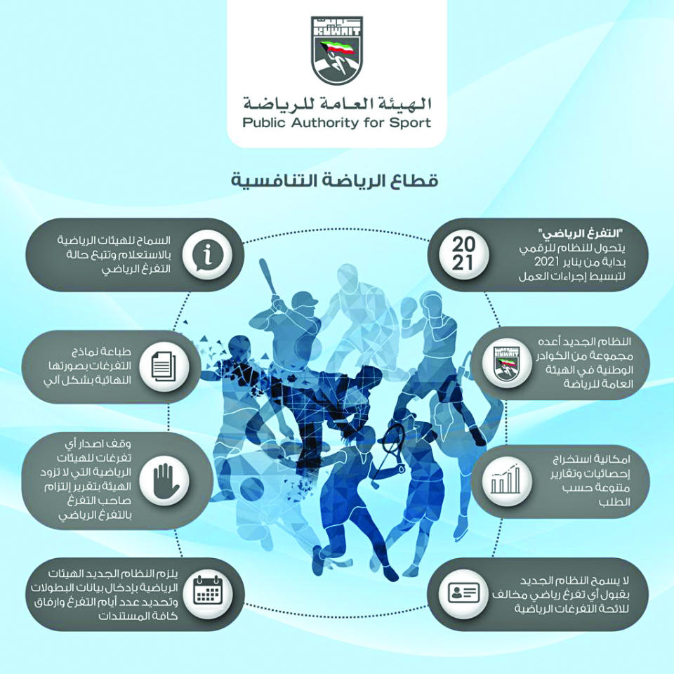 في خطوة تؤدي إلى مزيد من الشفافية وحفظ حقوق الرياضيين وتقضي على المحسوبية والكثير من المشاكل التي كانت للحصول على التفرغات الرياضية، أعلن نائب المدير العام للهيئة العامة للرياضة لشؤون الرياضة التنافسية د. صقر الملا، الانطلاق الرسمي لنظام "التفرغات الرياضية" الرقمي، على أن يتم تطبيقه على أرض الواقع اعتباراً من يناير المقبل.وقال د. الملا، خلال المؤتمر الصحافي، الذي عقد صباح أمس بمقر الهيئة، إن هذه الخطوة تأتي تماشياً مع خطة الهيئة في التحول للنظام الرقمي و"ميكنة الخدمات الالكترونية" وتبسيط إجراءات العمل، موضحاً أن النظام الجديد أشرف على إعداده مجموعة من الكوادر الوطنية في الهيئة.وأضاف "أن نظام التفرغات الرياضية يعتبر الخطوة الثانية في سلسلة التحول للنظام الرقمي، إذ كانت البداية بالتراسل الالكتروني الذي تم تطبيقه فعلياً بين الهيئة.