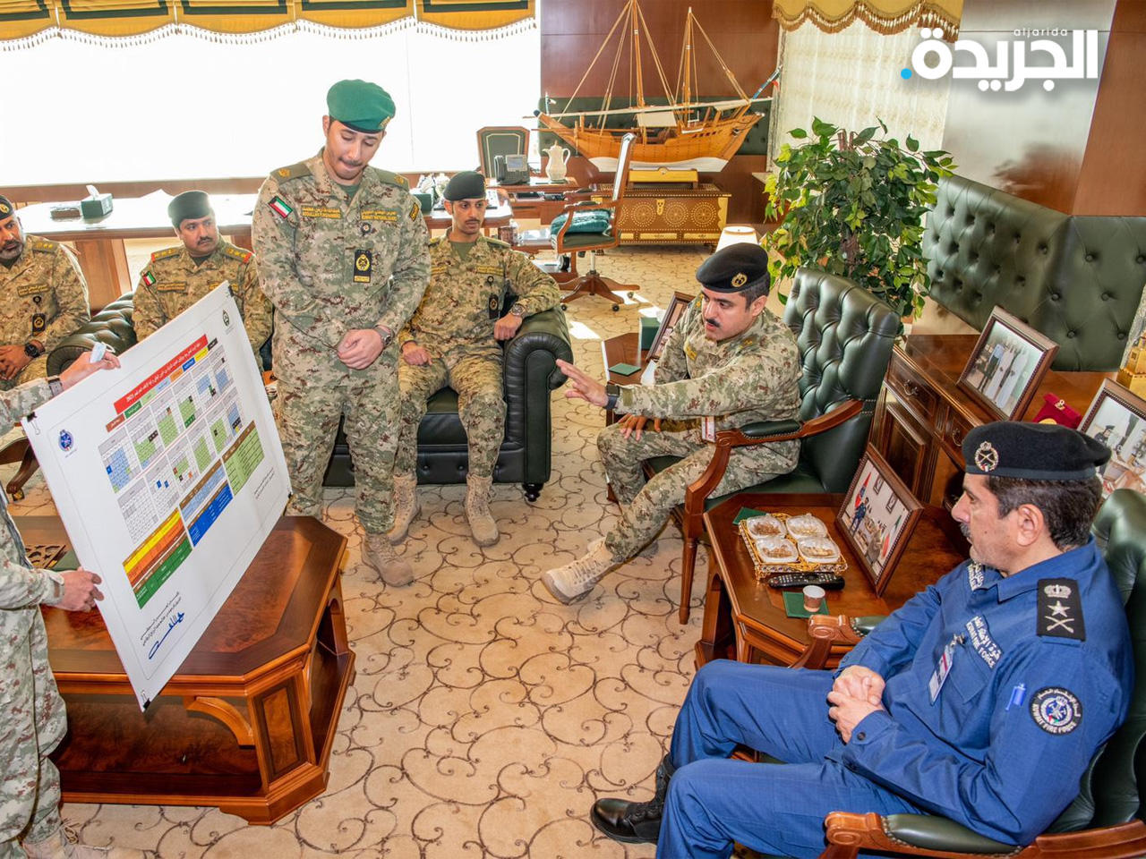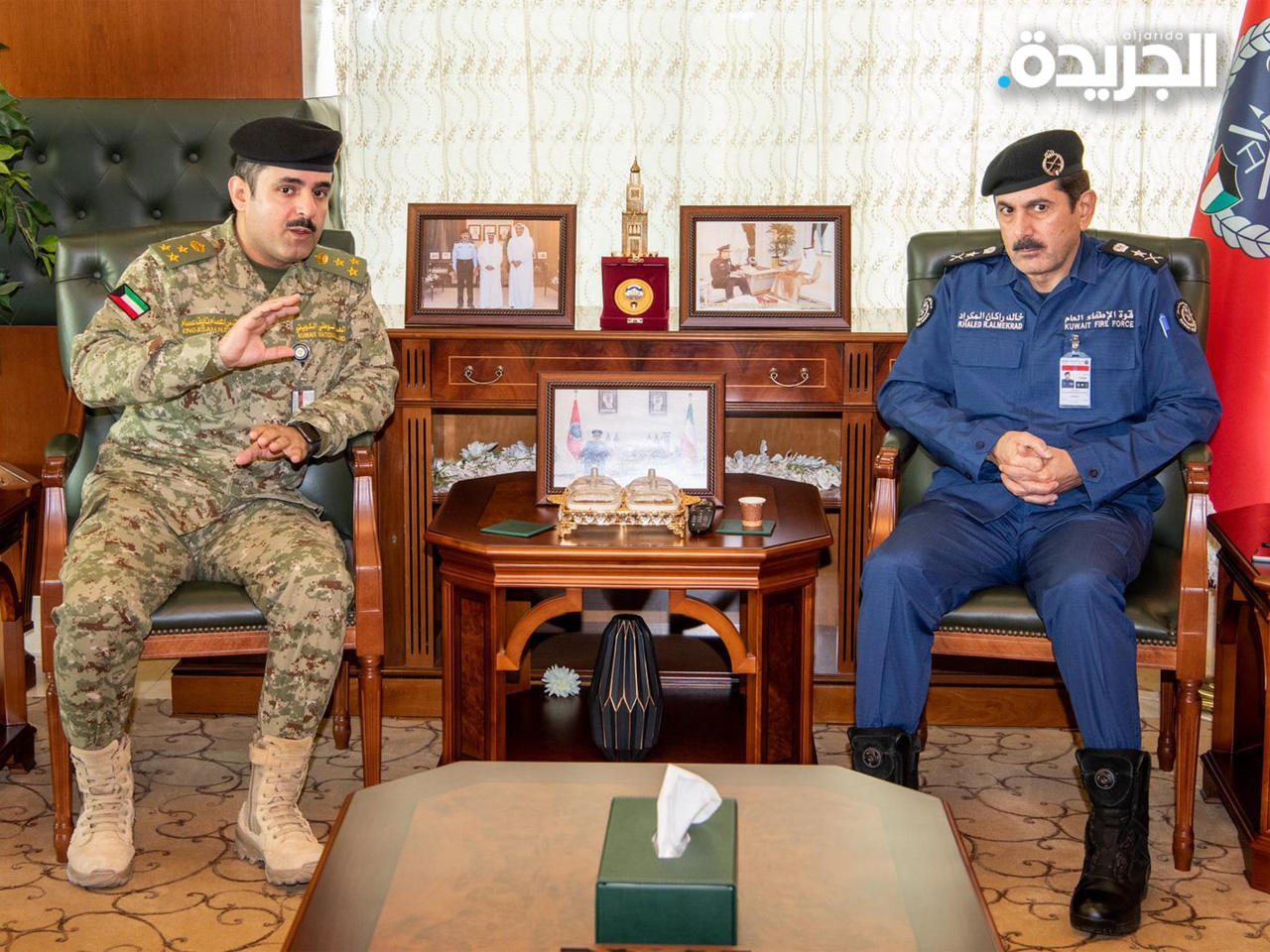 استقبل رئيس قوة الإطفاء العام، الفريق خالد المكراد، صباح اليوم، المعاون للإسناد الإداري بالحرس الوطني العميد المهندس عصام نايف، يرافقه ضباط الحرس الوطني المكلفين متابعة بروتوكول التعاون لعرض واعتماد الخطة الزمنية لتفعيل بنود التعاون المشترك بين الحرس الوطني وقوة الإطفاء العام لسنة 2021.وأشاد المكراد بالدور الفاعل والمجهود المتميز للتعاون بين الإطفاء والحرس الوطني من خلال البروتوكول والجهد المبذول في تحقيق التميز بالتعاون المؤسسي وتطوير العمل المشترك بين مؤسسات وأجهزة الدولة، من خلال تفعيل مثل هذه البروتوكولات.