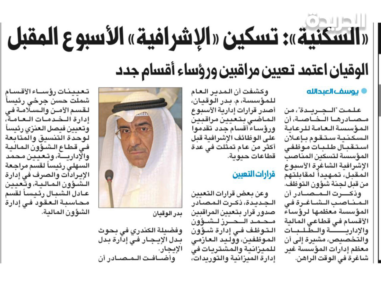 تأكيداً لما نشرته «الجريدة.» في عددها الصادر يوم الأربعاء الماضي 13 يناير، بدأت المؤسسة الأسبوع الجاري مقابلة المرشحين الذين اجتازوا الاختبارات التخصصية للوظائف المتقدم لها في 8 تخصصات مختلفة.وقالت «السكنية» أنه وبناءً على توجيهات وزير الدولة لشؤون الإسكان ووزير الخدمات د. عبدالله معرفي في تسكين الشواغر الوظيفية في المؤسسة العامة للرعاية السكنية بكوادر وطنية وتحقيق معايير الشفافية والعدالة في المقابلات الشخصية، بدأت المؤسسة الأسبوع الجاري مقابلة المرشحين الذين اجتازوا الاختبارات التخصصية للوظائف المتقدم لها في 8 تخصصات مختلفة.وأشرف الوزير معرفي على سير المقابلات والإجراءات المتبعة من خلال اللجنة المختصة بالتعيينات والتي من المقرر أن تستمر في أعمالها حتى 21 يناير الجاري ضمن المرحلة الثانية من سلسلة الإجراءات التي تقوم فيها المؤسسة لتعيين الموظفين حيث تم إعداد كشوف المرشحين بعد اجتيازهم الإختبارات التي تم اجرائها في 10 أكتوبر الماضي بالتعاون مع جامعة الكويت.