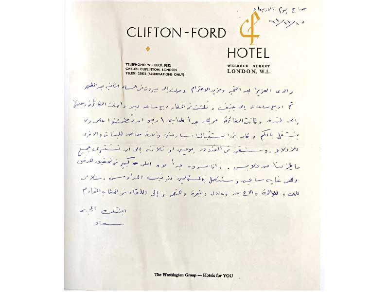 حزمت شقيقتي حقيبتها وتوجهت بصحبة الأسرة إلى مطار الكويت القديم، الذي تشغل موقعه حالياً منطقتا ضاحية عبدالله السالم والنزهة، وكانت لحظات الوداع صعبة، فقد انهمرت دموعنا مدراراً حزناً على فراقها تحت سلم طائرة B.O.A.C اختصاراً (للخطوط الجوية البريطانية لما وراء البحار)، لكن ما بعث الاطمئنان في نفوسنا، أنه كان معها عدد من الطالبات الكويتيات بالطائرة... واستمر التواصل معها عبر الرسائل والاتصالات والزيارات طوال وجودها بالخارج، حتى أتمت دراستها العليا بكلية البنات في الجزيرة آنفة الذكر.استغرقت الدراسة خمس سنوات كاملة، وحصلت على شهادة عليا في تدريس اللغة الإنكليزية، ثم رجعت إلى الكويت ودرّست مادة اللغة الإنكليزية في مدرستها التي تخرّجت فيها (ثانوية المرقاب)، وعند هدم المدرسة انتقلت للتدريس في ثانوية الجزائر، ثم في بعض المدارس الأخرى، وتخرّج على يدها المئات، بل الآلاف من الطالبات، هن الآن أمهات وجَدّات. كانت شقيقتي حريصة على تدريسي وفهمي لقواعد اللغة الإنكليزية وحفظها، وترجمة ما استعصى علّي فهمه، كما كانت حريصة على تدريس أبناء وبنات أصدقاء العائلة والأقارب بطرق مبسطة وحديثة لم تكن معروفة في ذلك الزمان، اكتسبتها خلال دراستها في بريطانيا.ماذا أقول يا شقيقتي في الذكرى الثالثة لرحيلك؟ إن سلوتي وعزائي وما يخفف حزني، هو طيب أعمالك وحُسن أفعالك الخيرية، والله أُشهِد أنك الابنة البارة لأهلك، وسما برُّك بوالديك عندما بنيتِ لهما مسجدين كبيرين من مالك الخاص، مجهزين بكل احتياجاتهما ثواباً لهما، إضافة إلى أعمالك الخيرية التي لا تُعد ولا تُحصى؛ والتي منها كفالات أيتام ودعاة لنشر الإسلام وحفر الآبار والتبرعات للإغاثة وصدقات للفقراء، وغير ذلك الكثير الكثير، وتوصيني دائماً بأن أودعها باسم "فاعلة خير"..!والله نسأل أن تكون هذه الأعمال في ميزان حسناتك، رحمك الله يا شقيقتي، وأسكنك في عليين مع الأنبياء والصالحين.الصورة بالمناسبة، أول رسالة بعد سفر شقيقتي للدراسة، وهي بتاريخ 1961/11/15م .
