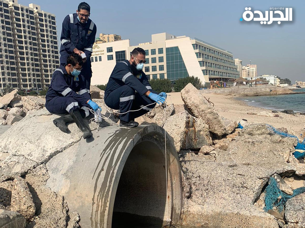 رصد الفريق البيئي المشترك بين وزارة الأشغال العامة والهيئة العامة للبيئة وصلة غير قانونية تم توثيقها خلال الزيارة الميدانية الأولى للفريق المشترك لمعاينة المجارير «A2 و A3 و A4».وقد قام الفريق إلى جانب عملية الكشف على المجارير ومدى وجود أي مخالفات أو تعديات غير قانونية فيها بعمل مجموعة من الفحوصات والتحليلات لمكونات المياه عند مصب تلك المجارير وجمع وتحليل العينات اللازمة من المياه المنصرفة للتأكد من مطابقتها للمعايير البيئية ولضمان الحد من تلوث البيئة الساحلية والبحرية.