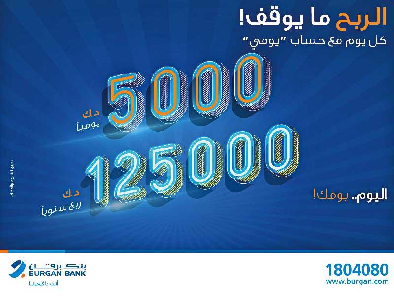 3. وائل حسني محمد بيدس4. فاتن فاروق نجم الدين النقيب5. إيلاف فيصل محمد انيوإضافة للسحب اليومي، يوفر بنك برقان سحبا ربع سنوي لحساب "يومي" للفوز بجائزة نقدية بقيمة 125000 دينار. وللتأهل للسحوبات ربع السنوية يتعين على العملاء ألا يقل رصيدهم عن 500 د.ك لمدة شهرين كاملين قبل تاريخ السحب، كما أن كل 10 د.ك تمثل فرصة واحدة لدخول السحب، وإذا كان رصيد الحساب 500 دينار وما فوق فسيكون صاحب الحساب مؤهلا للدخول في السحوبات اليومية وربع السنوية.