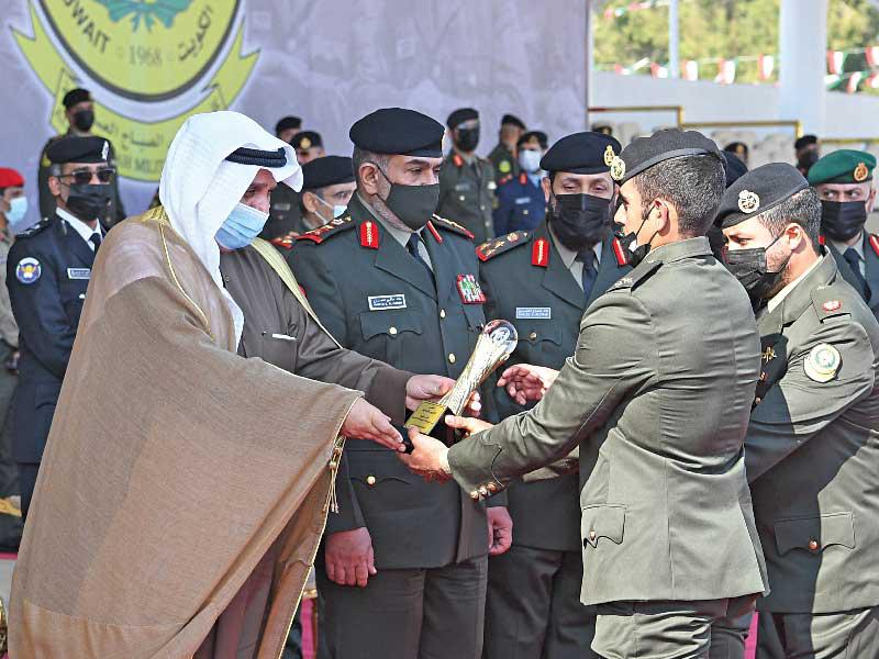 وأوضح أنه لتحقيق الأهداف الوطنية، فإن الكلية تسلك منهج الجد بلا شدة، والحزم بلا ظلم، والانضباط بلا قسوة، والالتزام بلا تعسف، لكي تستمر مصدراً لقيادات المستقبل، ولكي يتولى أمر الدفاع عن الوطن والحفاظ على أمنه واستقراره من هو جدير بهذه المسؤولية الكبيرة، وأهل للقيام بأعبائها، مشدداً على أنه لا مجاملة في أمن الكويت، ولا محاباة على استقرارها وعزتها وسيادتها.وقال العتيبي، إن التدريب هو عصب الجيوش، وهو العنصر الأكثر أهمية في تحديد كفاءتها القتالية، وبقدر ما يكون وافياً وشاملاً واحترافياً، بقدر ما يؤدي دوره في توظيف القدرات والطاقات والوسائل في الاتجاه الذي يقود إلى تحقيق النجاح والانتصار، موضحاً أن كلية علي الصباح العسكرية تضع باستمرار هذا المجال الحيوي، في أعلى درجات اهتماماتها، من خلال سعيها الدؤوب إلى تطوير وسائل التدريب ومناهج التعليم، وإخضاع الطلبة الضباط كافة وبصورة متواصلة، لتدريبات عملية سواء في الكلية أو في ميادين الكلية الداخلية والخارجية، وبالتعاون مع وحدات الجيش المختلفة. ولفت إلى أن قيادة الكلية تحرص على مواكبة مهمّاتها التدريبية لحظة بلحظة، وتحرص أشدّ الحرص على تزويدها بالوسائل التقنية والطاقات البشرية ذات الكفاءة، وهذا ما جعلها تتبوأ مكانة مرموقة بين الكليات العسكرية في المنطقة، مردفاً: لقد استمر العمل في الكلية خلال جائحة كورنا، وتم استخدام تقنية التعليم الإلكتروني، كذلك تم التدريب العملي في الأماكن المخصصة له مع الأخذ بجميع الاشتراطات والتدابير الصحية التي أقرها مجلس الوزراء.الجوائز للأوائل والمتفوقين