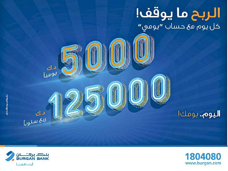 أعلن "برقان" أسماء الفائزين في السحوبات اليومية على حساب "يومي"، وفاز كل واحد منهم بجائزة 5.000 د.ك، وكان الحظ في هذه السحوبات من نصيب: محمد أصغر حيدر، محمد علي نكهبان، شاهاني اوميش شاهاني، مشاعل عويضه المانع، باقر حسين جعفر.ويوفر البنك سحبا ربع سنوي لحساب "يومي" للفوز بجائزة نقدية بقيمة 125.000 دينار كويتي.