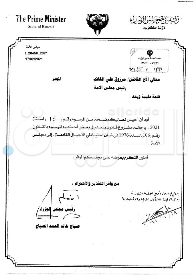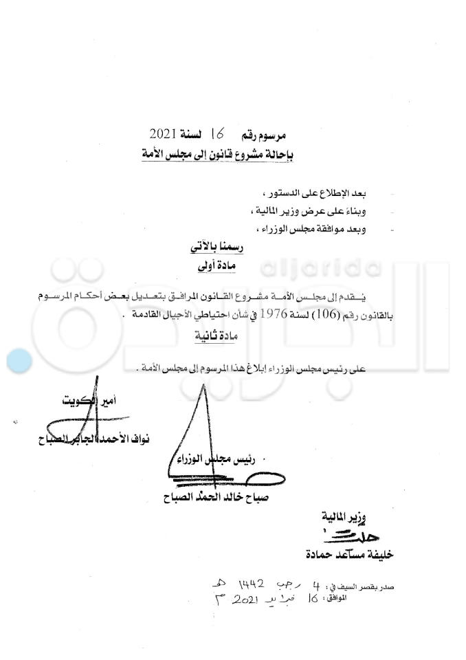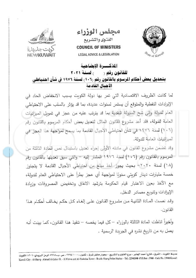 أحالت الحكومة إلى مجلس الأمة مشروعاً بقانون بتعديل بعض أحكام المرسوم بالقانون رقم (106) لسنة 1976 بشأن احتياطي الأجيال القادمة، إلى مجلس الأمة، وسط رفض نيابي واسع للمشروع الذي تمت إحالته إلى لجنة الشؤون المالية والاقتصادية البرلمانية.ونص المشروع على أن يستبدل بنص المادة الثالثة من المرسوم بالقانون المشار اليه النص الآتي: "يجوز أخذ مبلغ من احتياطي الأجيال القادمة لا يتجاوز خمسة مليارات دينار كويتي سنوياً".وقالت المذكرة الإيضاحية للمشروع الحكومي: "لما كانت الظروف الاقتصادية التي تمر بها دولة الكويت، بسبب الانخفاض الحاد في الإيرادات النفطية والمتوقع أن يستمر سنوات عديدة، بما قد يؤثر بالسلب على الاحتياطي العام للدولة ويؤدي إلى شح السيولة النقدية، بما قد يترتب عليه بعض احكام المرسوم بالقانون رقم (106) لسنة 1976 في شأن احتياطي الأجيال القادمة، بما يسمح لمواجهة هذا العجز في الميزانيات العامة للدولة".وأضافت المذكرة: "وقد تضمن مشروع القانون في مادته الأولى إجراء تعديل باستبدال نص المادة الثالثة من المرسوم بالقانون رقم (106) لسنة 1976 المشار اليه - والتي سبق تعديلها بالقانون رقم (18) لسنة 2020- بحيث يجوز أخذ مبلغ من احتياطي الأجيال القادمة لا يتجاوز خمسة مليارات دينار كويتي سنوياً، لمواجهة أي عجز يطرأ على الاحتياطي العام للدولة، مع الأخذ بعين الاعتبار قيام الحكومة بترشيد الانفاق وتخفيض المصروفات وزيادة الايرادات وتنويع مصادر الدخل".
