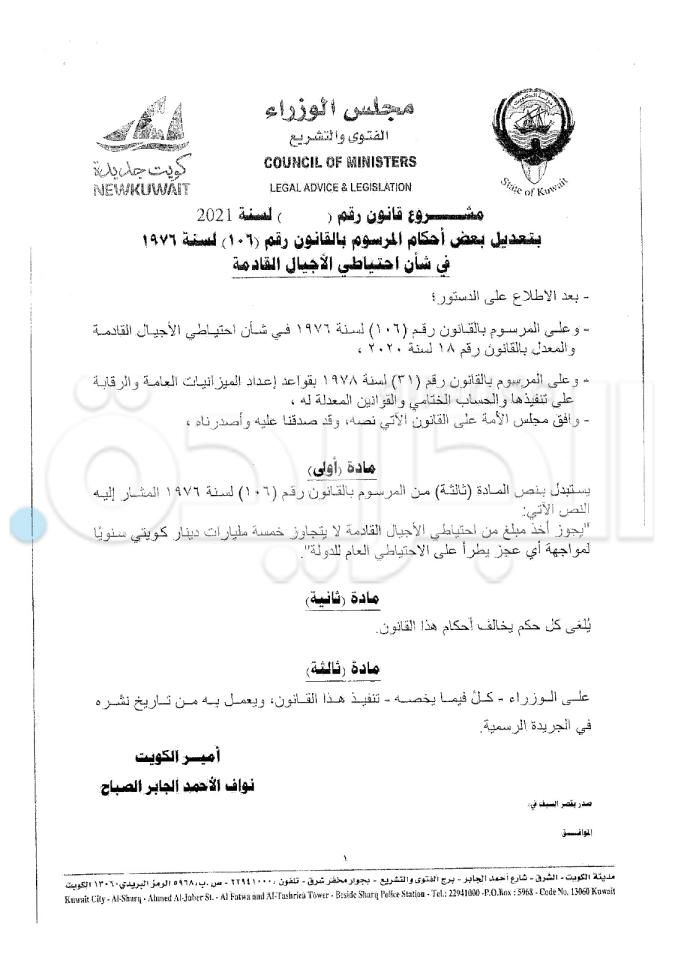 نص المشروع، الذي أحالته الحكومة إلى المجلس، على أن يُستبدل بنص المادة الثالثة من المرسوم بالقانون بشأن صندوق احتياطي الأجيال القادمة النص الآتي: «يجوز أخذ مبلغ من احتياطي الأجيال القادمة لا يتجاوز 5 مليارات دينار كويتي سنوياً».