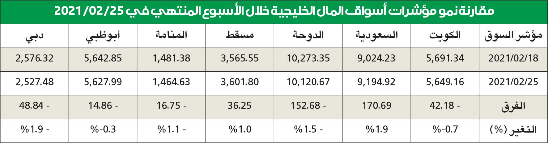 استمر الأداء الإيجابي لسوق المال السعودي، خصوصا مؤشر سوقه الرئيسي «تاسي»، وحقق نمواً جديداً خلال تعاملات الأسبوع الأخير من فبراير، ليربح بنهاية الأسبوع نسبة كبيرة بلغت 1.9 في المئة تعادل 170.69 نقطة ليقفل على مستوى 9194.92 نقطة، مدعوما بنمو مستمر لأسعار النفط، خصوصا آخر جلساته، والذي لامس خلاله برميل برنت مستوى 67 دولارا للبرميل في اعلى مستوى منذ نهاية عام 2019، كما لعبت نتائج الشركات السنوية المتدفقة بشكل يومي الأداء، ويعتبر نمو الشركات السعودية القيادية الأفضل خليجيا، خصوصا القطاعات الرئيسية كالبنوك والطاقة، وبدعم مستمر من نمو قطاع الاسمنت.وارتد مؤشر سوق الأسهم العماني، بعد سلسلة من التراجعات إلى أعلى، وربح نسبة 1 في المئة، وبعد عدة أسابيع من التراجع تخللها ارتدادات محدودة ابقته بالنطاق السالب كنمو سنوي حتى الآن، وانتهى الأسبوع الماضي بمكاسب بنسبة 1 في المئة مرافقا السوق السعودي بالمنطقة الخضراء، حيث جمع 38.25 نقطة ليقفل على مستوى 3601.8 نقطة متفائلا بارتفاعات أسعار النفط التي تقلص فجوة العجز في موازنة السلطنة، إذ يعتبر سعر تعادل أسعار النفط في موازنتها ثاني أكبر سعر بعد البحرين.