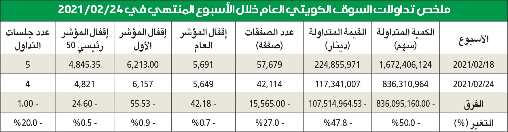 واستمر التراجع في مؤشر السوق القطري، الذي لم ير نموا أسبوعيا واضحا عدا بداية هذا العام، إثر إعلان المصالحة الخليجية، وبالرغم من ارتفاع أسعار النفط فإن مؤشر السوق القطري خسر كثيرا منذ بداية العام ونزف 4.6 في المئة، وهي اكبر خسارة بين دول مجلس التعاون الخليجي، حيث أضاف بنهاية الاسبوع الماضي 1.5 في المئة، أي 152.68 نقطة، ليقفل على مستوى 10120.67 نقطة، ولم يعد يفصله عن كسر مستوى نفسي مهم وهو 10 آلاف نقطة سوى 120 نقطة فقط، ولم تدعم نتائج شركات السوق القطري مؤشره، حيث كان تراجع نمو معظمها.وخسر مؤشر سوق البحرين 1.1 في المئة، وبعد إعلان البنك الأهلي المتحد توزيعته السنوية وأرباحه لعام 2020، والتي واجهت بعمليات بيع كبيرة وضغط على السهم القيادي الكبير في سوقي الكويت والبحرين على حد سواء ليفقد مؤشر سوق البحرين 1.1 في المئة بنهاية الأسبوع، حيث استعاد كثيرا من خسارة بدايته السلبية، وانتهى بفقد 16.75 نقطة ليقفل على مستوى 1464.63 نقطة.بورصة الكويت