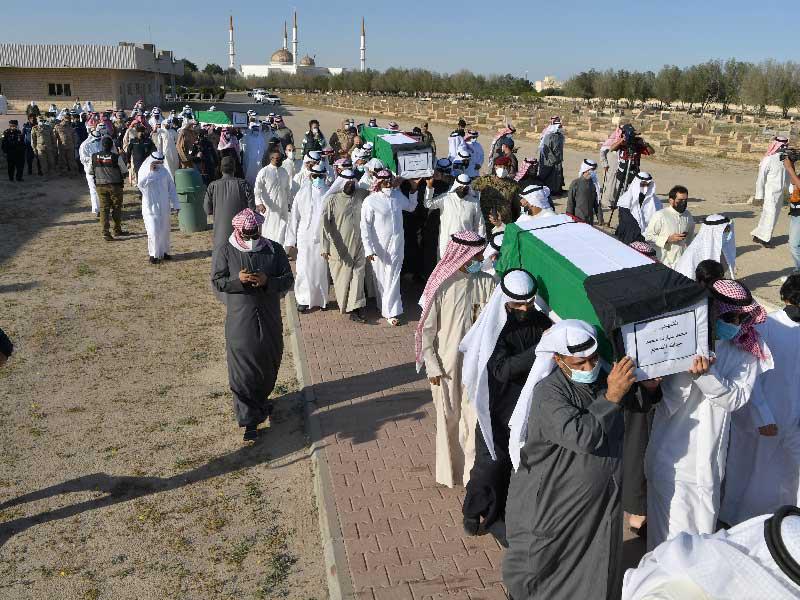 وقد جرت مراسم دفن الشهداء في مقبرة الصليبيخات عصر أمس، وسط حضور رسمي وشعبي تقدّمه وزراء الداخلية الشيخ ثامر العلي، والصحة د. باسل الصباح، والتربية د. علي المضف، والإعلام عبدالرحمن المطيري، وسفير خادم الحرمين الشريفين لدى البلاد سلطان بن سعد، ورئيس الأركان العامة للجيش، الفريق الركن الفريق خالد الصالح، ووكيل وزارة الداخلية الفريق عصام النهام، وعدد من قيادات وزارتي الدفاع والداخلية وأهالي الشهداء وحشد من المواطنين.