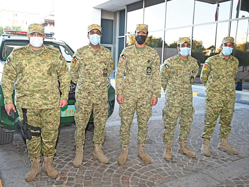 عناصر من «الحرس الوطني» خلال تأمين أحد فنادق الحجر المؤسسي أمس