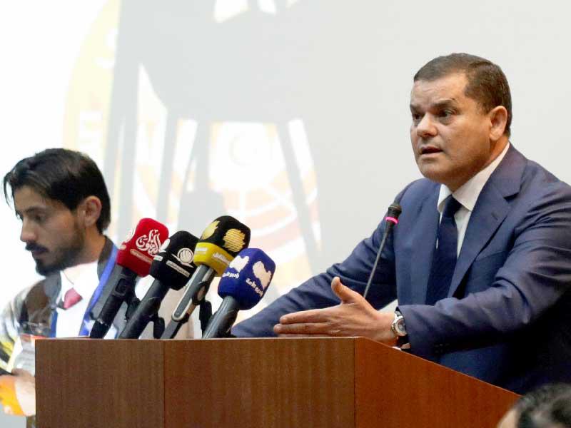 وسط ترقب لمنح الثقة، أعلن رئيس حكومة الوحدة الوطنية الليبية عبدالحميد الدبيبة، أمس، أمام مجلس النواب في جلسته الاستثنائية المنعقدة بمدينة سرت، تشكيلته الحكومية، موضحا أنها تشمل 26 وزارة، و6 وزراء دولة، مع نائبين له.وفي حين قام مدير مكتبه الإعلامي محمد حمودة بإعلان أسماء الوزراء، لم يقم رئيس الحكومة بتسمية وزير الدفاع، مؤكداً «انه سيحتفظ بها لنفسه مرحليا لحين الوصول إلى اتفاق بشأن هذه الحقيبة»، وفيما يخص وزارة الخارجية والتعاون الدولي أفاد بأنها ستخصص للمرأة، وستتم تسمية من يشغلها بعد التشاور مع المجلس الرئاسي.