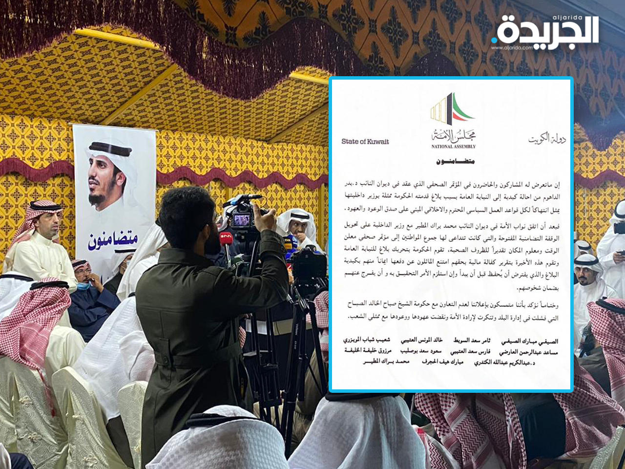 فبعد أن اتفق نواب الأمة في ديوان النائب محمد براك المطير مع وزير الداخلية على تحويل الوقفة التضامنية المفتوحة والتي كانت تتداعى لها جموع المواطنين إلى مؤتمر صحفي معلن الوقت ومعلوم المكان تقديراً للظروف الصحية، تقوم الحكومة بتحريك بلاغ للنيابة العامة وتقوم هذه الأخيرة بتقرير كفالة مالية بحقهم امتنع المماثلون عن دفعها ايماناً منهم بكيدية البلاغ والذي يفترض أن يحفظ قبل أن يبدأ وإن استلزم الأمر التحقيق به وأن يفرج عنهم بضمان شخوصهم.وختاماً نؤكد بأننا متمسكون بإعلاننا لعدم التعاون مع حكومة الشيخ صباح الخالد الصباح التي فشلت في إدارة البلد وتنكرت لإرادة الأمة ونقضت عهودها ووعودها مع ممثلي الشعب.النواب المشاركون في البيان:الصيفي مبارك الصيفي، ثامر سعد السويط، خالد المونس العتيبي، شعيب شباب المويزري، مساعد عبدالرحمن العارضي، فارس سعد العتيبي، سعود سعد بوصليب، مرزوق خليفة الخليفة، د. عبدالكريم عبدالله الكندري، مبارك هيف الحجرف، محمد براك المطير.