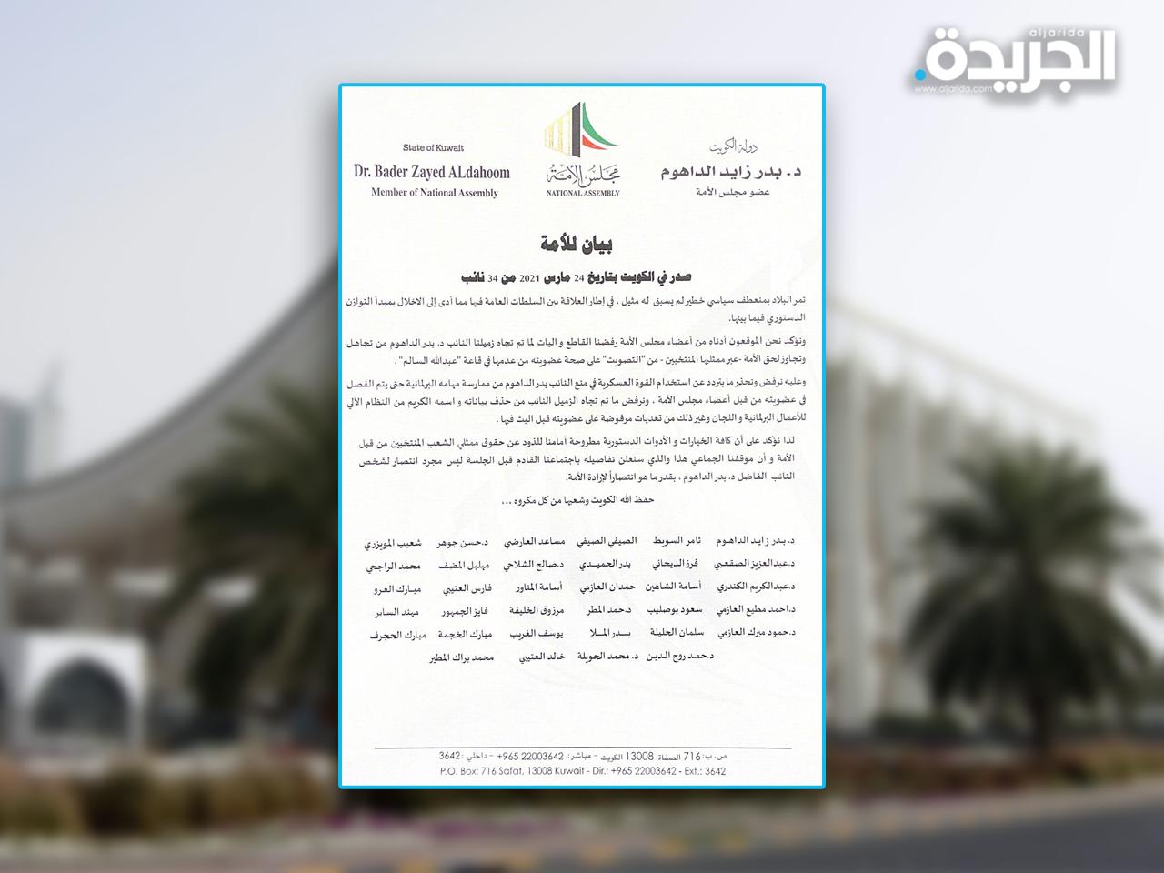 عقب الاجتماع النيابي الذي عقد في مكتب النائب الذي أبطلت المحكمة الدستورية عضويته د. بدر الداهوم صدر بيان مشترك مذيل بتوقيع 34 نائباً، جاء فيه: «تمر البلاد بمنعطف سیاسي خطير لم يسبق له مثيل، في إطار العلاقة بين السلطات العامة فيها، مما أدى إلى الاخلال بمبدأ التوازن الدستوري فيما بينها».وأضافوا: «ونؤكد نحن الموقعين أدناه من أعضاء مجلس الأمة رفضنا القاطع والبات لما تم تجاه زميلنا النائب د. بدر الداهوم من تجاهل وتجاوز لحق الأمة - عبر ممثليها المنتخبين - من التصويت على صحة عضويته من عدمها في قاعة عبدالله السالم».وتابعوا: «وعليه نرفض ونحذر ما يتردد عن استخدام القوة العسكرية في منع النائب بدر الداهوم من ممارسة مهامه البرلمانية حتى يتم الفصل في عضويته من قبل أعضاء مجلس الأمة، ونرفض ما تم تجاه الزميل النائب من حذف بياناته واسمه الكريم من النظام الآلي للأعمال البرلمانية واللجان، وغير ذلك من تعديات مرفوضة على عضويته قبل البت فيها».وقالوا: «لذا نؤكد أن كل الخيارات والأدوات الدستورية مطروحة أمامنا للذود عن حقوق ممثلي الشعب المنتخبين من قبل الأمة، وأن موقفنا الجماعي هذا، والذي سنعلن تفاصيله في اجتماعنا القادم قبل الجلسة، ليس مجرد انتصار لشخص النائب الفاضل د. بدر الداهوم، بقدر ما هو انتصار لإرادة الأمة».وعقب صدور البيان، نفى النائب سلمان الحليلة حضوره الاجتماع أو تكليفه احدا بالتوقيع نيابة عنه.من جهته، قال النائب حمدان العازمي: لا يمكن منع الداهوم من دخول الجلسة القادمة، خاصة أن المجلس لم يصوت على إسقاط عضويته، وأي تصرف فردي بمنعه يتحمل مسؤوليته رئيس المجلس الذي يجب عليه احترام إرادة الشعب، أما عن الخلاف القضائي حول عضوية الداهوم فسيحسمه مجلس الأمة.بدوره، قال النائب خالد العتيبي: نحن أمام قضية سياسية لا قضائية، وما وقع على النائب بدر الدهوم اليوم سيقع على الجميع مستقبلاً، مستدركاً بالقول: من لا يوردها مواريد الأبطال... يشرب من كفوف الليالي غبينه.