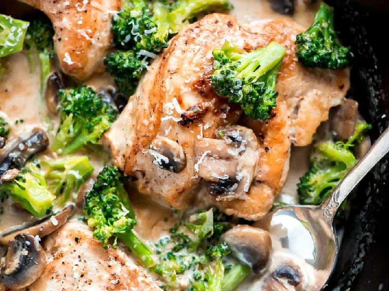 المقادير:2/1 كيلوغرام بروكلي طازج مقطع2/1 كيلوغرام صدور دجاج مسلوقة ومقطعة مكعبات300 غرام كريمة3/1 كوب حليب2/1 كوب جبنة شيدر مبشورةملعقة زبدة مذابة2 ملعقة من قطع التوست المحمص الطريقة:- يسخن الفرن على درجة حرارة 230 مئوية، ونضع البروكلي في إناء صغير مع ماء بحيث يغمره ونترك البروكلي يغلي لمدة 5 دقائق، ثم نصفيه.- نضع البروكلي في صينية للخبز ونضع فوقه الدجاج ونتركه جانباً. وفي وعاء آخر نمزج الشوربة مع الحليب والكريمة، ثم نسكبها فوق الدجاج والبروكلي ونوّزع على الوجه مبشور الجبنة الشيدر. ونمزج الزبدة المذابة مع قطع التوست المحمص ونوزعها كطبقة أخيرة على الوجه.- ندخل صينية الدجاج والبروكلي في الفرن لمدة 15 دقيقة أو إلى أن يميل اللون إلى البني الفاتح.