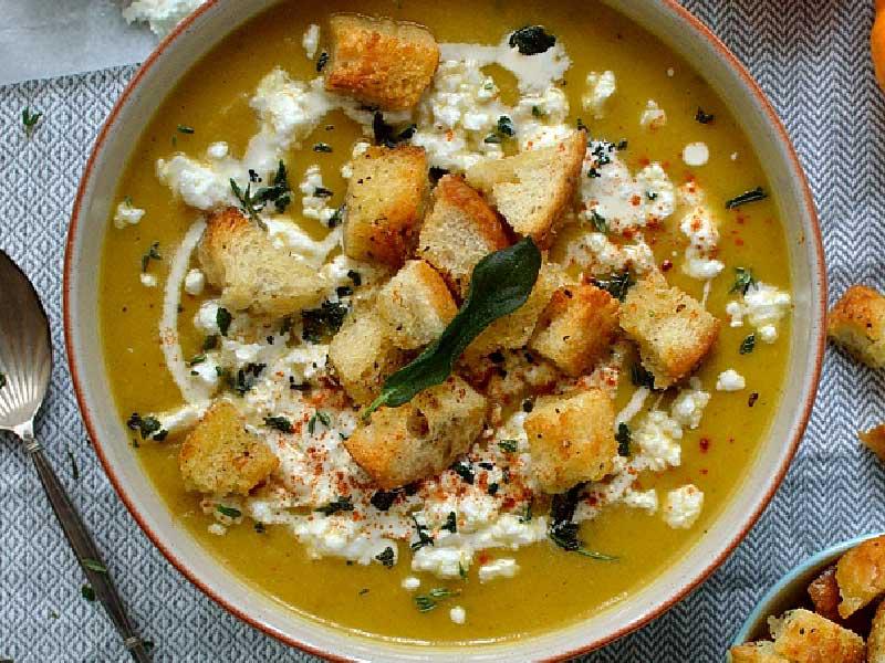المقادير:حبة مقطعة مكعبات متوسطة الحجمملعقة كبيرة زيت زيتونملعقة كبيرة زبدةحبة بطاطس متوسطة مقشرة ومقطعة مكعباتملح وفلفل أسود (حسب الرغبة)50 غرام جبنة بارميزان50 غرام جبنة شيدركوب حليب100 غرام كستناء مقشر ومسلوقحبة بصل مفرومةليتر مرق دجاجشرائح ليمون (للتزيين) الطريقة:- في إناء على النار نسخن الزيت والزبدة ونضيف البصل مع التقليب حتى يذبل ثم نضيف الملح والكستناء مع استمرار التقليب، ونضيف القرع والبطاطس ونحرك المزيج لمدة 5 دقائق.- نضيف مرق الدجاج للقرع والبطاطس ونغطي الإناء ونتركه حتى يتضج المكونات تماماً، لمدة 20 – 30 دقيقة.- في الخلاط الكهربائي نخفق الشوربة جيداً، ثم نضيف الحليب ونخفق مرة أخرى.- نعيد المزيج إلى القدر ونضعه على نار هادئة ونتركه حتى الغليان لمدة 5 دقائق ونضيف للمزيج الفلفل مع نصف كمية الجبن، ونقلب جيداً.- نزين الشوربة بباقي الجبنة وتقدم ساخنة. بسكويت الليمون وجيلي الأناناس
