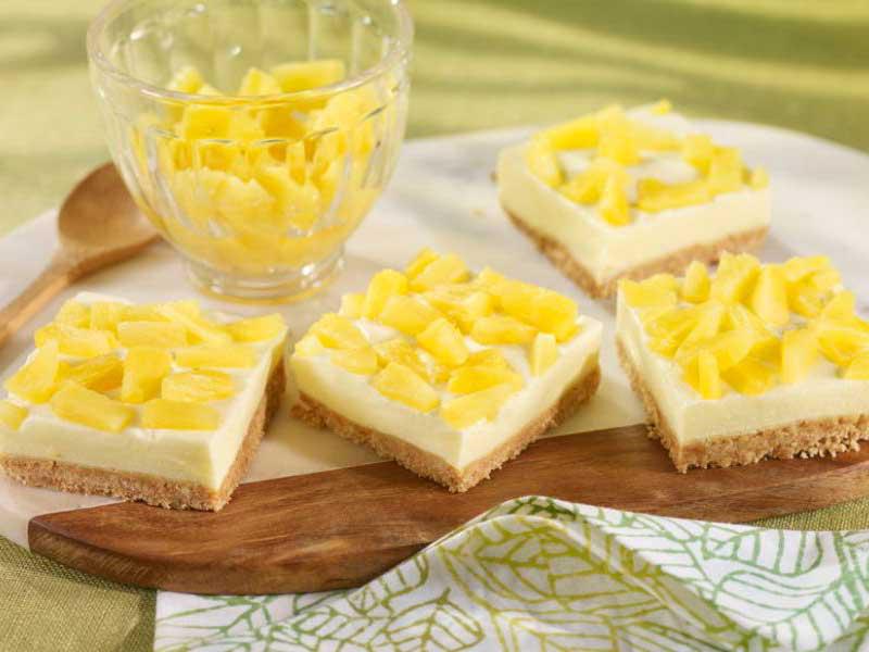 المقادير:كوب حليب مُكثف ومُحلى2 عبوة بسكويت سادةبياض 2 بيضة4 ملاعق عصير ليمون2 كوب سائل جيلي أناناس الطريقة:- في الخلاط الكهربائي نخفق اللبن والليمون جيداً لمدة 5 دقائق، ثم نضيف لهذا الخليط بياض البيض، ونواصل خفق كل المكونات جيداً، ثم نضع الخليط في البراد لمدة 60 دقيقة.- نطحن البسكويت جيداً ونضعه في قالب كبير، ونسكب عليه خليط اللبن والليمون ونضع مقداراً من الجيلي السائل المعد مسبقاً، ونضعه في البراد لمدة 30 دقيقة، ثم نزيتنه بقطع الأناناس ونقطعه إلى مربعات ويقدم.