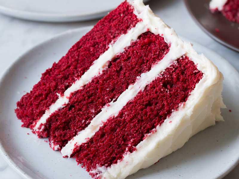 المقادير:2 ونصف كوب دقيق ملعقة صغيرة كاكاو (ينخل مع الدقيق)ملعقة صغيرة ملح1 وربع كوب سكر2/1 كوب زبدة مذابة2/1 كوب زيت نباتي 3/2 كوب لبن زبادي3/1 كوب حليب كامل الدسم2 حبة بيض، حجم كبير3 بيضات بحجم صغير2 ملعقة صغيرة فانيليا سائلة ملعقة كبيرة خل ملعقة صغيرة كربونات الصودا2 ملعقة كبيرة ملوّن الطعام الأحمركوب سيربالكريمة:400 غرام جبنة الكريم (بدرجة حرارة الغرفة)2/1 كوب زبدة2 كوب سكر باودرملعقة صغيرة فانيليا الطريقة:في الخلاط الكهربائي، نخفق البيض والفانيليا جيداً، ثم نضيف السكر ونخفق جيداً مرة أخرى، ثم نضيف الزبدة الذائبة والزيت ولون الطعام الأحمر والزبادي والحليب ويخفق الخليط جيداً، ثم نضيف الدقيق تدريجياً ويخفق الخليط بحرص.في صينية مدهونة بالسمن، نضع الخليط السابق كله ونخبزه في فرن ساخن حرارته متوسطة (180 مئوية) لمدة 30 دقيقة، ثم نخرج الصينية من الفرن ونتركها لمدة 5 دقائق ثم نقلب الكيك على شبكة، ونتركه لتبرد تماماً، ثم نخفق مقادير الكريمة جيداً في الخلاط الكهربائي، ونقطع الكيك عرضياً إلى ثلاثة أجزاء متساوية الارتفاع، ونضع قطع الكيك بحذر على صوانٍ ونصب على الكيك بكمية قليلة من السيرب، ثم نوزع 3/1 كمية الكريمة على الطبقة السفلية من الكيك، ثم توضع الطبقة الوسطى فوقها، ثم نوزِّع 3/1 كمية الكريمة، ثم الطبقة العليا، بحيث تكون جهة القطع إلى أسفل، وتُغطى بباقي الكريمة من دون الجوانب، ثم نضعها في البراد لمدة 90 دقيقة قبل التقديم.