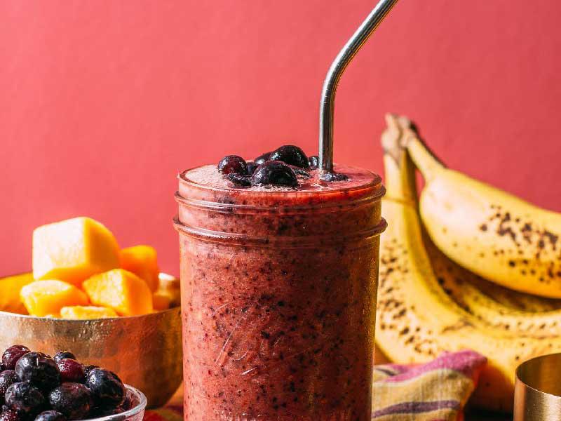 المقادير:كوب ماءكوب زباديكوب مانجوكوب توت بري مجمدحبة موز2/1 ليمونة مقشرة الطريقة:في الخلاط الكهربائي، نضع كل المكونات ونخلطها جيداً حتى تمتزج، ثم نسكبها في كاسات التقديم، ويمكن تزيين الوجه بحبات من التوت أو العنب. سلطة البطاطا الحلوة