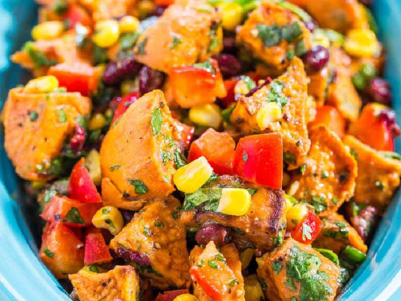 المقادير: 2/1 كيلوغرام بطاطا حلوة مقطعة مسلوقة2 حبة بصل شرائح4 أكواب طماطم كرزية مقطّعة إلى أنصافكوب جرجيرملعقة كبيرة زيت زيتونملعقة كبيرة سماقملعقة كبيرة عصير ليمونملعقة كبيرة دبس رمانرشة ملحفلفل أسود (حسب الرغبة) الطريقة:في إناء عميق، نضع زيت الزيتون وعصير الليمون والسماق ودبس الرمان ونقلِّب جيداً، ثم نضيف الملح والفلفل الأسود ونتركه جانباً.نقشر البطاطا المسلوقة وفي وعاء التقديم نضعها ونسكب فوقها الخليط المتبل، ونقلِّب كل المكونات برفق حتى تمتزج وتكتسب البطاطا مذاق التتبيلة، ثم تزين بأوراق الجرجير أو البقدونس والطماطم وحبيبات الذرة الشامية. شوربة الكابوريا بالذرة الحلوة