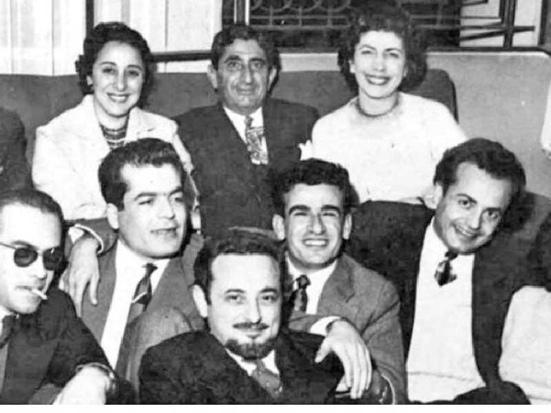 لقاء في منزل يوسف الخال بالحمرا في سياق اجتماعات مجلة شعر. من اليمين جلوساً على الأرض فدوى طوقان وأدونيس وفؤاد رفقة ويوسف الخال ومحمد الماغوط وشوقي أبي شقرا، ومن اليمين إلى أعلى لور غريب وسلمى الخضراء الجيوسي وبدوي الجبل ونازك الملائكة وجورج صيدح