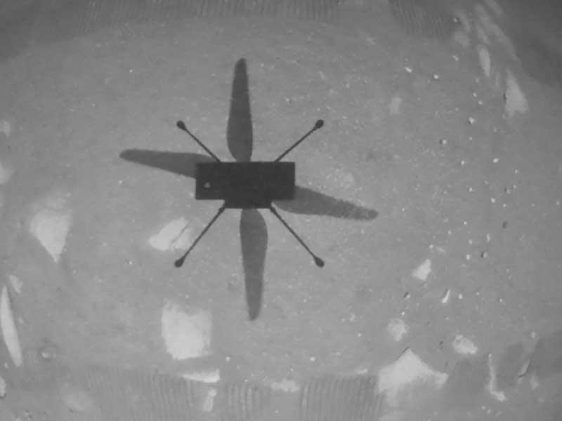 ونشرت الوكالة مقطع فيديو قصيراً عن الرحلة، التقطته العربة الجوالة «برسيفرنس» التي وصلت على متنها «إنجينيتي» إلى الكوكب الأحمر. وأظهر المقطع مركبة تحلق على علو 3 أمتار، قبل أن تهبط على سطح المريخ، وأرسلت المروحية نفسها صورة بالأبيض والأسود يظهر فيها ظلها على الكوكب.وتشكل المهمة تحدياً كبيراً، لأن كثافة الهواء في «المريخ» توازي 1% من الموجودة في الغلاف الجوي للأرض، علماً أن دفع الهواء بواسطة دوران مراوح الطوافة يمكّنها من التحليق.ورغم أن الجاذبية أدنى من الموجودة على الأرض، اضطرت فرق «ناسا» إلى تطوير مركبة فائقة الخفة مع مراوح تدور بسرعة أعلى من المروحيات العادية.وتتألف المروحية من 4 قوائم وهيكل ومروحتين متراكبتين، ويبلغ طولها 1.2 متر من أحد طرفي النصل إلى الطرف الآخر، وهي أشبه بمسيّرة ضخمة.وهذا الحدث المريخي بمستوى أهمية إنجاز أول رحلة طيران بمحرّك على كوكب الأرض للأخوين رايت عام 1903، إذ وُضعت قطعة قماش من طائرتهما، التي أقلعت في هذه المهمة قبل أكثر من قرن بولاية كارولاينا الشمالية، على «إنجينيتي»، في تحية لرحلة الطيران الأرضية الأولى.