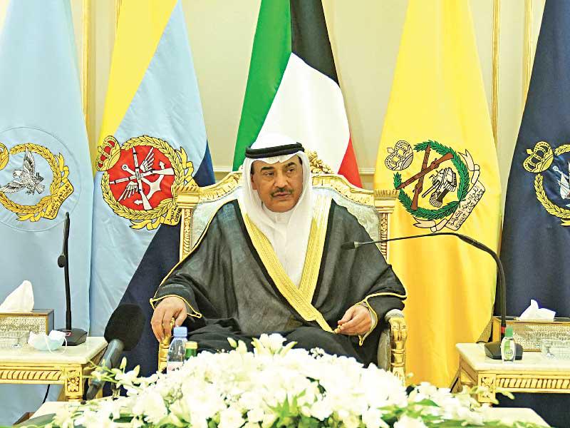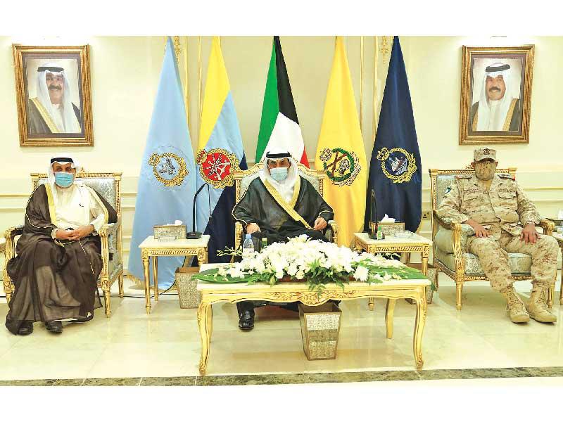 رئيس مجلس الوزراء سمو الشيخ صباح الخالد متوسطاً نائب رئيس مجلس الوزراء وزير الدفاع الشيخ حمد الجابر ورئيس الأركان العامة للجيش الفريق الركن الشيخ خالد الصالح خلال زيارة نادي ضباط الجيش