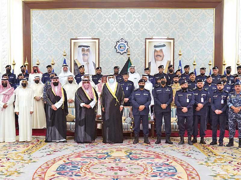 رئيس مجلس الوزراء سمو الشيخ صباح الخالد متوسطاً وزير الداخلية وكبار الضباط خلال الزيارة