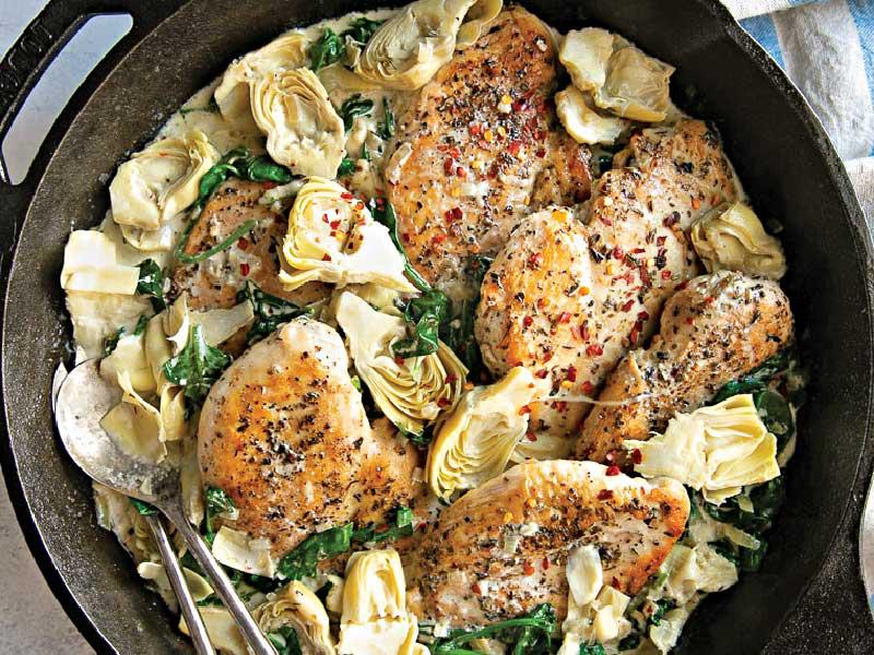 المقادير:ملعقة كبيرة زبدة4 قطع صدور دجاج مخلية2 حبة بصل أحمر مقطع مكعبات2 كوب سبانخكوب خرشوف مفروم4/1 كوب فطر مقطعملح وفلفل أسود (حسب الرغبة)كوب جبنة كريمية3/1 كوب مايونيز3/1 كوب قشدة حامضة4/1 ملعقة صغيرة ثوم مفرومكوب جبنة موتزاريلا4/1 كوب جبنة بارميزان الطريقة: