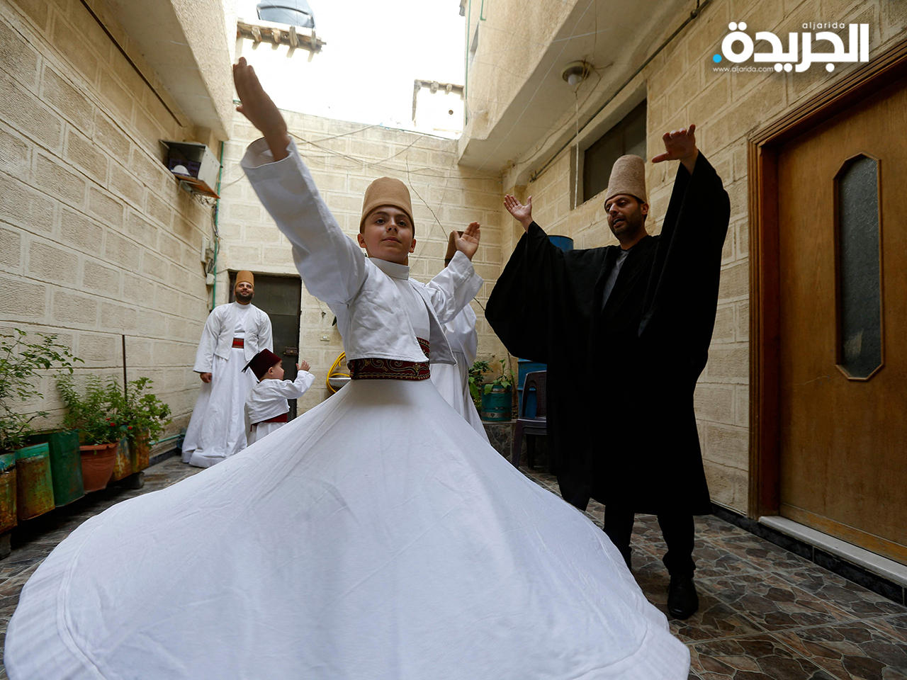 ويُضيف «كلّما أشعر بالضيق جراء ظروف الحياة والوضع المعيشي والأزمة التي مررنا بها، عندما اشعر بضغط شديد، أختلي بنفسي في غرفتي وأدور وأدور حتى أشعر بالراحة النفسية».قبل بدء جلسات التدريب، يساعد مؤيد أنس، الكثير الحركة مع ابتسامة لا تفارق وجهه، على ارتداء زي الدراويش، ويتألف من ثوب أبيض فضفاض، يزنّره حزام غالباً ما يكون أحمر اللون، ويرتدي الدراويش عادة قبعة أسطوانية الشكل، بنّية اللون «أقرب ما تكون إلى لون الأرض والتراب الذي جاء منه الإنسان ويعود إليه»، كما يشرح مؤيد.وقد يعتمرون أحياناً طرابيش سوداء ترمز بشكلها المتطاول إلى حرف الألف، أول حروف الأبجدية العربية وأول حرف من كلمة «الله».على أنغام أناشيد دينية وابتهالات لله يؤديانها، يدرّب مؤيد وشقيقه الأكبر محمود عدداً من الأطفال على الدوران حول أنفسهم في باحة منزل العائلة، يبلغُ مؤيّد حالة تعزله عن محيطه خلال دورانه مغمض العينين، فيما يقلّده أنس بشكل عفوي.يعمل محمود «34 عاماً» على تصحيح حركات يد الأطفال خلال الدوران، ويشرح «مدّ اليدين نحو الأعلى إشارة لطلب الرحمة من الله والدعاء نحو السماء، وفي قبض الأيادي نحو الصدر دلالة على التذلّل والتواضع إلى الله».الدراويش