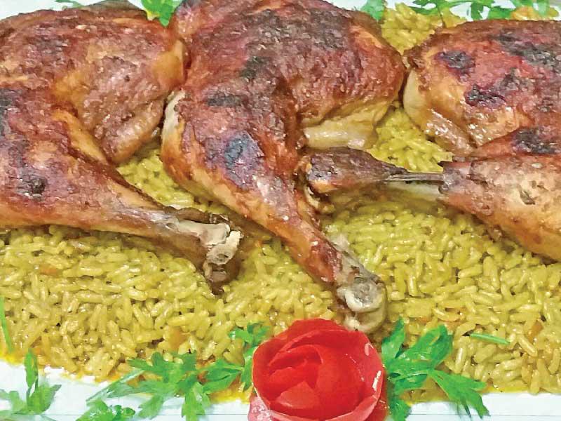 المقادير:أفخاذ دجاجأرزحبة بصلفص ثومحبة جزرحبة طماطمبازلاءهيل وعود قرفةورق غار وكركمزبدة الطريقة:نتبل أفخاذ الدجاج بماء بصل وملح وفلفل أسود وبهارات دجاج وزنجبيل وزعتر وبصل وثوم باودر، وملعقة خل وعصير ليمونة وملعقة صلصة وملعقة سكر، ونترك الدجاج في اتتبيلة لمدة 4 ساعات.وفي إناء على النار نشوِّح أفخاذ الدجاج في الزبدة إلى أن تكتسب لوناً ذهبياً، ثم ننتشل الدجاج ونتركه جانباً مؤقتاً، وفي الإناء نفسه نشوّح البصل والثوم وعود القرفة وورق الغار والهيل، ثم نضع الجزر والطماطم والبازلاء والملح والفلفل وبهارات دجاج والكركم، مع التحريك جيداً، ثم نضع الدجاج مجدداً في الإناء ونضيف ماءً ساخناً لإنضاج أفخاذ الدجاج مع الخضراوات ونتركها على النار حتى تنضج، ثم ننتشل أفخاد الدجاج وندهن الوجه بالكاتشاب مع رشة زعتر ونضعها في الفرن، وبعد أن يحمر الوجه تُقدم في طبق مع الأرز المبهر.