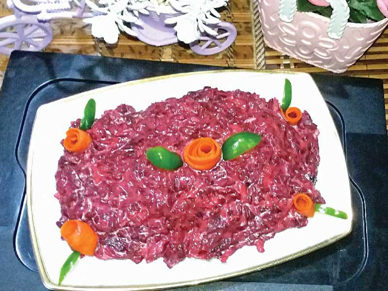 المقادير:بنجر مسلوق ومبشور2/1 كوب مايونيز4 فصوص ثوم مفرومملح وفلفل أسود وكمونملعقة خلملعقة عصير ليمون الطريقة:نخلط الملح والثوم والفلفل الأسود والكمون والخل والليمون جيداً ونضعها على البنجر مع التقليب جيداً، ثم نضع المايونيز ونخلط المكونات جيداً ونقدمها في طبق السلطة. ترافيل النوتيلا