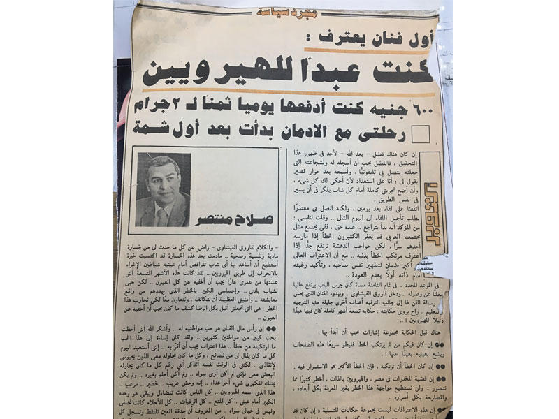 في الموعد المحدد بين الفيشاوي ومنتصر كان جرس الباب يرتفع عالياً معلناً وصول الأول، وقبل أن يسرد حكايته، استهلها بقوله إن «قضية المخدرات والهيرويين بالذات، أخطر كثيراً مما نتصوّر، ولن نستطيع مواجهة هذا الخطر بغير معرفة كل أبعاده، والمصارحة بكل أسراره، فهذه الاعترافات ليست مجموعة حكايات للتسلية، وإن كان قد كتب عليّ أن أخوض جحيم التجربة وكتبت لي النجاة منها بفضل الله وفضل وقفة زوجتي (سمية الألفي آنذاك)، الصديقة والأم والحبيبة بكل مشاعرها المخلصة».أدرك الفيشاوي أن رأسمال الفنان هو حب الجمهور، وكان إساءة إلى هذا الحب ما ارتكبه من خطأ، وعليه أن يستعيد كل ما كان يُقال له من نصائح، ويحاوله معه الذين يحبونه لإنقاذه، وفي الوقت نفسه يتذكر أنه رغم كل ما كان يحاوله البعض معه فإنه لم يكن يرى سواه، ولم يكن يحلم بغيره، ولم يكن يمتلك تفكيره شيئاً آخر عداه.. إنه وحش غريب، خطير، مرعب، هذا المسمى بالهيرويين... كل الناس كانت تتضاءل ويبقى وحده الكبير أمام عينيه.. كل الأحلام كانت تختفي وليس في خياله سواه.ومن المعروف أن حدقة العين تلتقط وتسجل كل صورة ننظر إليها... ولكن عين المدمن مختلفة، وتنظر إلى آلاف الصور، وآلاف الناس، بينما لا ترى سوى صورة جرعة الهيرويين وحدها التي تحتل كامل حدقة العين ورؤيتها.والمفارقة أن أول ظهور حقيقي للفيشاوي في السينما كان في فيلم «الباطنية» عام 1980، الذي تدور أحداثه حول تجارة المخدرات، ولكن اعترافاته الجريئة كانت تصلح لسيناريو جديد حول هذا العالم، ولعلها ستكون أكثر واقعية وتأثيراً، وترتكز على المواجهة المباشرة في سرد التجربة، وتأجل ظهور هذا المشروع السينمائي حول فنان شهير سقط في بئر الإدمان.الدخان الأزرق