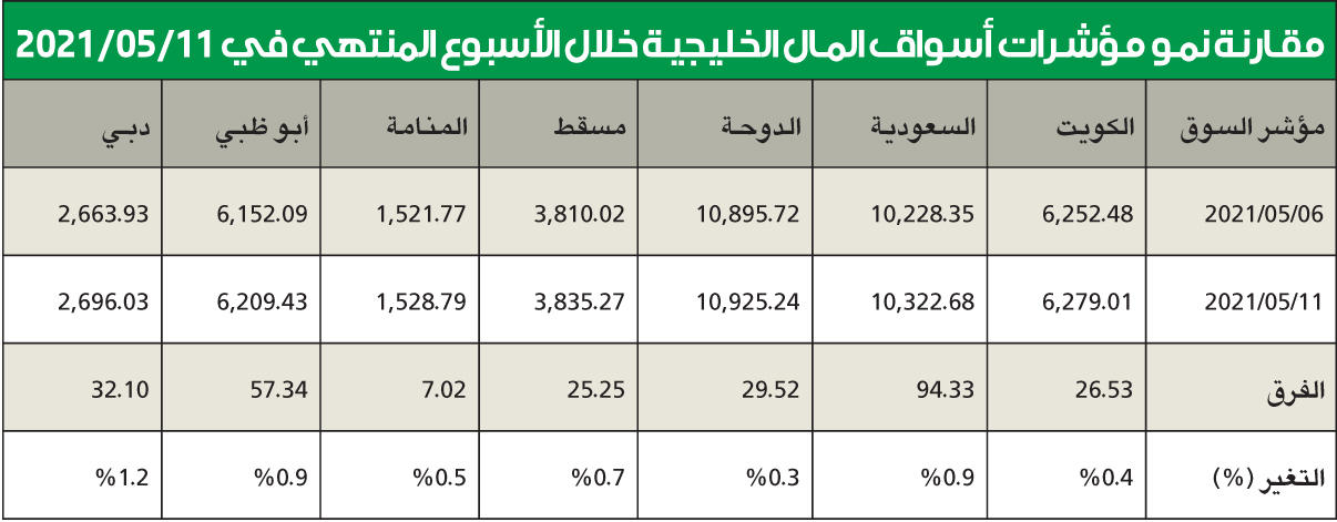 وكان مؤشر سوق البحرين المالي أضاف نصف نقطة مئوية تساوي 7.02 نقاط ليقفل على مستوى 1528.79 نقطة، وسجل مؤشر بورصة الكويت العام ارتفاعاً بنسبة 0.4 في المئة أي 26.53 نقطة ليقفل على مستوى 6279.01 نقطة، وأخيراً كان مؤشر سوق قطر المالي الأقل من حيث المكاسب إذ ربح ثلث نقطة مئوية فقط تساوي 29.52 نقطة ليقفل على مستوى 10925.24 نقطة مقترباً أكثر نحو مستوى 11 ألف نقطة.وكانت أسعار النفط مستقرة حول مستوى68.7 دولاراً للبرميل بنهاية تعاملات الأسبوع الماضي وبعد أن ربحت بنهاية الأسبوع حوالي 2 في المئة، مما أعادها إلى ما انتهت عليه خلال تعاملات الأسواق المالية بدول مجلس التعاون الخليجي قبل عطلة عيد الفطر.