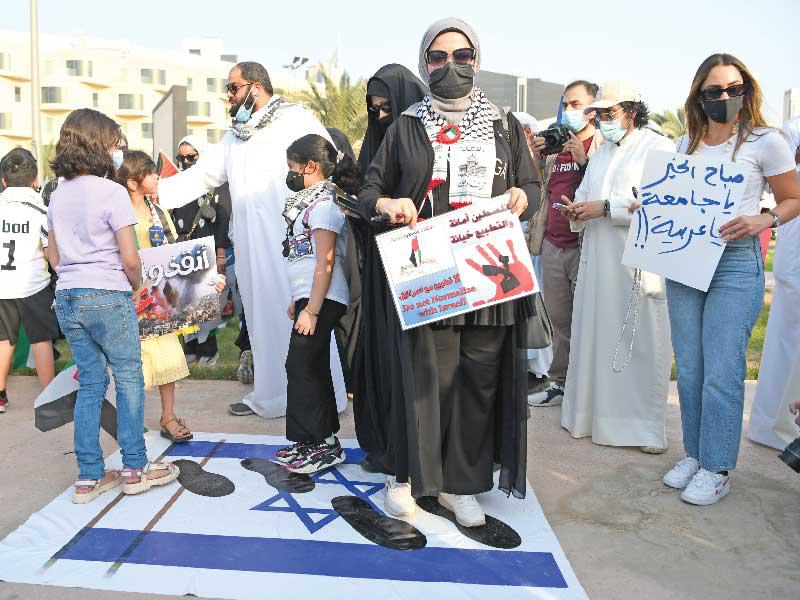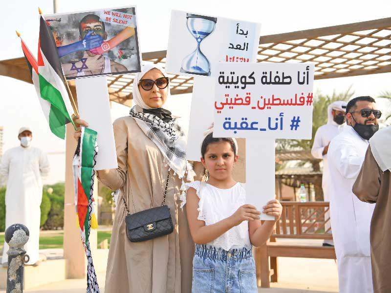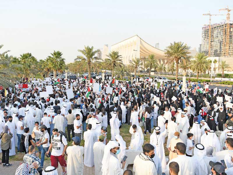 نفذ مئات المواطنين والمقيمين اعتصاماً، بعد ظهر أمس، في ساحة الإرادة دعماً للفلسطينيين في مواجهة ما يتعرضون له على يد الاحتلال الإسرائيلي.وفيما فرضت وزارة الداخلية إجراءات على مداخل الساحة وأغلقت الطرقات المؤدية إليها، فقد سمحت للمشاركين بالتوجه سيراً على الأقدام إلى الساحة، حيث رفعت الشعارات المؤيدة لفلسطين والمنددة بالمجازر الإسرائيلية، كما ألقيت كلمات لعدد من النواب والمنظمين دعماً لفلسطين.وأعلن نواب مجلس الأمة المشاركون بالاعتصام، وهم عدنان عبدالصمد، وحسن جوهر، وأسامة الشاهين، وحمد المطر، وأحمد الحمد، عن تبني نواب المجلس مشروع قانون تجريم التطبيع مع الكيان الصهيوني، كما أعلنوا مطالبتهم مجلس الوزراء بضرورة السماح بإقامة المهرجانات الخطابية المتضامنة مع القضية الفلسطينية، وضرورة مناصرة الشعب الفلسطيني الصامد بالداخل ودعمه بكل ما يحتاج، حتى يواصل صموده في وجه الكيان الصهيوني الغاصب.