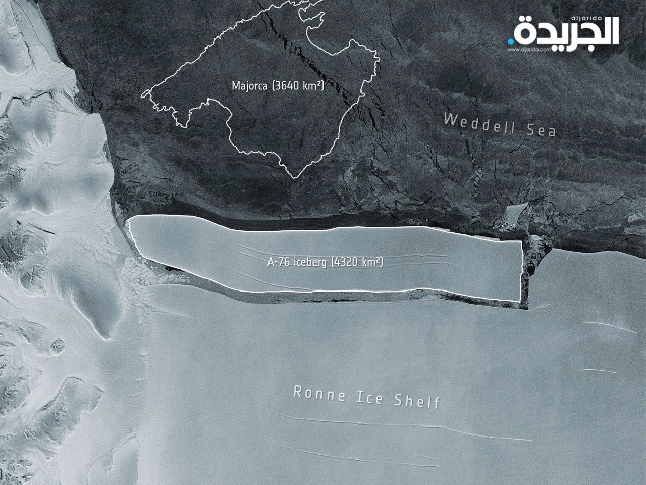 قالت وكالة الفضاء الأوروبية إن قطعة ضخمة من الجليد، أكبر من جزيرة مايوركا الإسبانية، انفصلت عن الحافة المتجمدة للقارة القطبية الجنوبية، واتجهت نحو بحر "ويدل"، لتصبح أكبر جبل جليدي طافٍ في العالم. وذكرت الوكالة، في بيان نشرته على موقعها الإلكتروني مصحوباً بصورة للجبل البيضاوي الضخم، إن القمر الصناعي "سنتينال-1" من مجموعة أقمار "كوبرنيكوس" رصد الجبل الجديد، وأطلق عليه العلماء اسم "إيه-76".ويمتد الجبل على مساحة سطحية تبلغ 4320 كيلومتراً مربعاً وهو ما يوازي نحو ربع مساحة دولة الكويت ويبلغ طوله 175 كيلومتراً وعرضه 25 كيلومتراً.وبالمقارنة تبلغ مساحة جزيرة مايوركا في البحر المتوسط 3640 كيلومتراً مربعاً، وحتى ولاية رود آيلاند الأميركية مساحتها أقل، حيث لا تتجاوز 2678 كيلومتراً مربعاً.