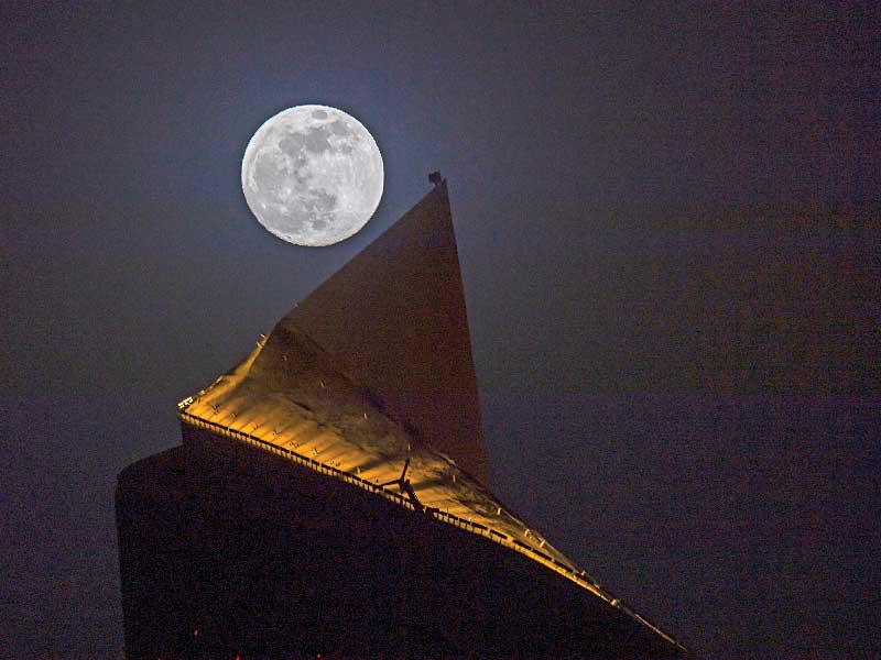 بزغ القمر أمس بدرا عملاقا في سماء الكويت للشهر الثاني على التوالي، حيث بدا أكثر إضاءة بنحو 30 في المئة، وأكبر حجما بنحو 14 في المئة، وتحدث هذه الظاهرة لأن القمر قريب نحو 360 ألف كم من الأرض.وفي الصورة، التي التقطها عبدالمجيد الشطي، أمس الأول، ظهر القمر في طريقه إلى نقطة الحضيض (أقرب نقطة إلى الأرض) معانقا برج الحمراء في الكويت.