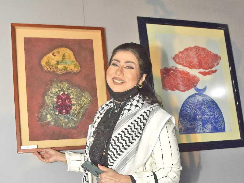 وحضر المعرض مجموعة من الفنانين، منهم فاطمة الطباخ، وباسمة حمادة، التي أشادت بتنظيم المعرض، وأعربت عن سعادتها بالمشاركة والحضور نصرة للقضية الفلسطينية، وتأكيدا على دور الفنان في دعم قضايا وطنه.وأضافت حمادة: "عشت القضية الفلسطينية منذ الصغر، وتربينا على الإخلاص لها منذ الطفولة، ويجب علينا جميعا التكاتف وتقديم كل سبل الدعم لإخواننا الفلسطينيين، ودور الفنان كبير جدا، ويتجلى اليوم في هذا المعرض الرائع، الذي يضم أجمل إبداعات الفنانين التشكيليين بالكويت، تعبيرا عن إيمانهم الراسخ بالقضية ونصرة الأقصى".بدورها، أكدت الفنان التشكيلية ثريا البقصمي، أنها فخورة بالمشاركة من خلال لوحة رسمتها منذ سنوات، لكن آن الأوان أن تعبّر بها عن نصرة الأقصى، وهي عبارة عن قبة المسجد باللون الأزرق تعلوها سُحب حمراء بلون الدم الفلسطيني.كما شارك الفنان التشكيلي هيثم جوهر بلوحة جسَّد فيها قبة الأقصى مُحاطة بالحجارة التي يدافع بها الفلسطينيون عن أرضهم، مستخدما ألوان الأكريلك. وشاركت مسؤولة بيت الخزف الكويتي التشكيلية ديمة القريني بعمل يجسّد الأقصى تتساقط منه الحجارة، مع تطعيم الصورة بالتطريز الفلسطيني الرائع، لكن في صورة محزنة، حيث تتساقط منه الدماء.عزة إبراهيم