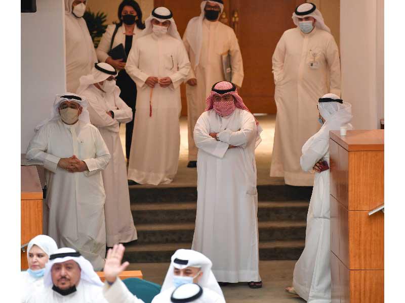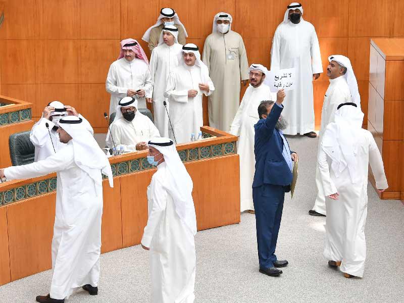 وعقب تلاوة أسماء الحضور والمعتذرين توالت نقاط النظام، الرافضة للجلسة من كتلة الـ 31، والتي أكد النائب خالد العتيبي أنها باطلة، وأنه لا يجوز لمكتب المجلس إلغاء جلسة عادية واستبدالها بخاصة، وهو ما دفع رئيس مجلس الأمة إلى أخذ موافقة المجلس على صحة الإجراءات الدستورية، وأثناء التصويت اعترض النواب مجددا على التصويت بينهم العتيبي. وبعد الانتهاء من قائمة المتحدثين الطويلة، صوّت المجلس على مشاريع الميزانية، كما وردت من الحكومة، والتي وافق عليها بأغلبية الحاضرين ممثلة في 32 عضواً، وأحالها إلى الحكومة.وأعلن الرئيس الغانم أنه سيكون هناك جلسة خاصة للحالة المالية للدولة الأسبوع المقبل، في وقت دعا النائب شعيب المويزري النواب إلى الاعتصام بمجلس الأمة احتجاجاً على مخالفة اللائحة والدستور.افتتح رئيس مجلس الأمة مرزوق الغانم الجلسة الخاصة، التي استمرت نحو ثلاث ساعات، لمناقشة مشروعات القوانين بربط الميزانيات للسنة المالية 2021 /2022، بناءً على طلب نيابي قدمه 15 نائباً، وتلا الأمين العام للمجلس أسماء الحضور والمعتذرين عن الجلسة التي غاب عنها النائب محمد المطير لإصابته بفيروس كورونا.وفي موازاة جلوس النواب على مقاعد الوزراء، وحضور الحكومة واقفة، رفع النائب د. صالح المطيري لافتة "لا تشريع دون رقابة"، قبل أن ينسحب النائب د. عبدالكريم الكندري من القاعة مع عدد من النواب لإفشال النصاب، لكن الغانم افتتح الجلسة في ظل وجود عدد كبير من الأعضاء. عقب ذلك، توالت نقاط النظام، وتساءل النائب الكندري، الذي عاد إلى الجلسة، عن السند القانوني للدعوة لعقد جلسة خاصة بهذه الطريقة، في وقت قال النائب ثامر السويط للغانم: "من أعطاك الحق بأن تلغي جلسة عادية وتستبدلها بأخرى خاصة؟!"، مؤكداً أن هناك دستوراً ولائحة، "ولا تملك أن تغير الجدول الى جلسة خاصة، فما هو السند القانوني لذلك؟".بدوره، قال النائب مبارك الحجرف: يجب ألا تتباكى الحكومة على العرف الدستوري بشأن الجلوس على مقاعدها في الصفوف الأمامية، في وقت ذكر النائب فارس العتيبي أن الحكومة برئيسها يقولون لا توجد جلسة لأن النواب جالسون في مقاعد الوزراء، "فليشهد الشعب على هذا الوضع"، ليرد الغانم: نقاط النظام غير منقولة بالتلفزيون.وقال النائب سعود بوصليب: ما يجوز بأي حال أن تقر ميزانية قيمتها 24 مليار دينار ولا نستطيع محاسبة الحكومة على دينار واحد.وفي هذه الأثناء، تساءل الغانم: "هل هناك وجهة نظر مختلفة عما قيل؟ ليرد السويط: ليس شرطاً أن تكون مختلفة"، فقال الغانم، "شرط، واقعد، فنقاط النظام ليست منقولة في التلفزيون بأمري"، وهنا استشاط عدد من النواب غضباً خصوصاً النائب سعود بوصليب الذي قال: "لا ننتظر التلفزيون، سندافع عن الشعب".أما النائب مساعد العارضي فقال: نحن في انقلاب على الدستور، اليوم الحكومة واقفة على الباب حتى تقر الميزانيات، ويتم إعطاء صلاحيات لرئيس الوزراء على أموال الشعب، مشدداً على أن وجود الوزراء على مداخل الصالة عيب في حقهم.وتحدث النائب سعدون حماد كذلك في نقطة نظام، قائلاً: 4 جلسات ما صارت بسبب جلوس النواب في مقاعد الوزراء، في حين قال النائب د. صالح ذياب المطيري: نحتاج إلى صوت العقل والمنطق، والعمل منذ أشهر لا نعلم مدى انعكاسه على المستقبل، ويمكن لأي وزير أن ينحرف عن جادة الصواب ويتم الاستشهاد بهذه الجلسة، من يتحمل المسؤولية فيما يتم عرضه والتصويت عليه ولا يطبق؟ وأنت يا رئيس المجلس سوف تحاسب على ذلك، ليس عناداً بل حق يجب أن يقر، وسوف يسجل التاريخ ذلك.من جانبه، قال النائب أسامة المناور: أرجو عرض نص المادة (90) من الدستور، وهي واضحة الدلالة، فكل اجتماع في غير المكان والزمان يكون باطلاً، متسائلاً: ما المسوغ لتغيير وقلب الجلسات العادية الى جلسة خاصة، فلدينا نص دستوري واضح؟بدوره، قال النائب الصيفي الصيفي إن المجالس والحكومات السابقة التي حُصِّنت تطاولت على المال العام، ومجلس 2016 هو الذي حصنهم، فلماذا تحصن هذه الحكومة؟ فمسؤوليتنا الرقابة، وتحصين الر