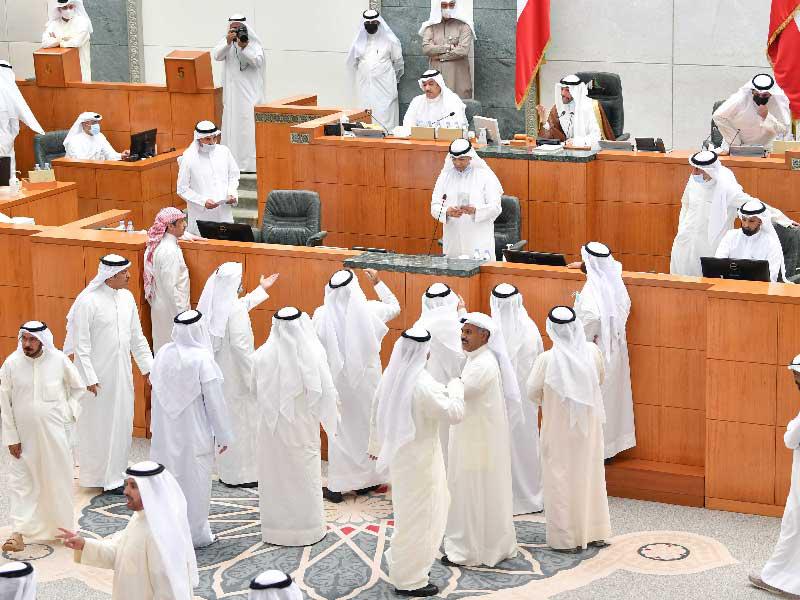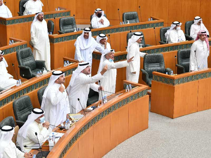 على صفيح ساخن، مرت الميزانية العامة للدولة 2021/ 2022، من بوابة الجلسة الخاصة التي عقدها مجلس الأمة، أمس، بناء على طلب نيابي قدمه 15 نائباً، والتي استمرت ثلاث ساعات فقط، وشهدت أحداثها "هوشات" وصلت لمرحلة التشابك بالأيدي في نهايتها، واعتراضات كثيرة في بدايتها.وكما أعلنوا مسبقاً، جلس عدد من نواب كتلة الـ 31 على مقاعد الحكومة في الصفوف الأمامية المخصصة للحكومة في قاعة عبدالله السالم، احتجاجا على عقدها، في حين حضرت الحكومة برئيسها واقفة عند مدخل القاعة في أغلب أوقاتها، بينما تمكن وزيرا المالية والكهرباء والماء، في بدايتها، من الجلوس على مقعديهما، وحضر معهما بالقاعة الوزراء مبارك الحريص وعيسى الكندري وعبدالرحمن المطيري.وشهدت لحظة افتتاحها انسحاب عدد من النواب منها، بدعوة من النائب د. عبدالكريم الكندري، في محاولة لإفشال النصاب، لكنهم لم يتمكنوا من ذلك.