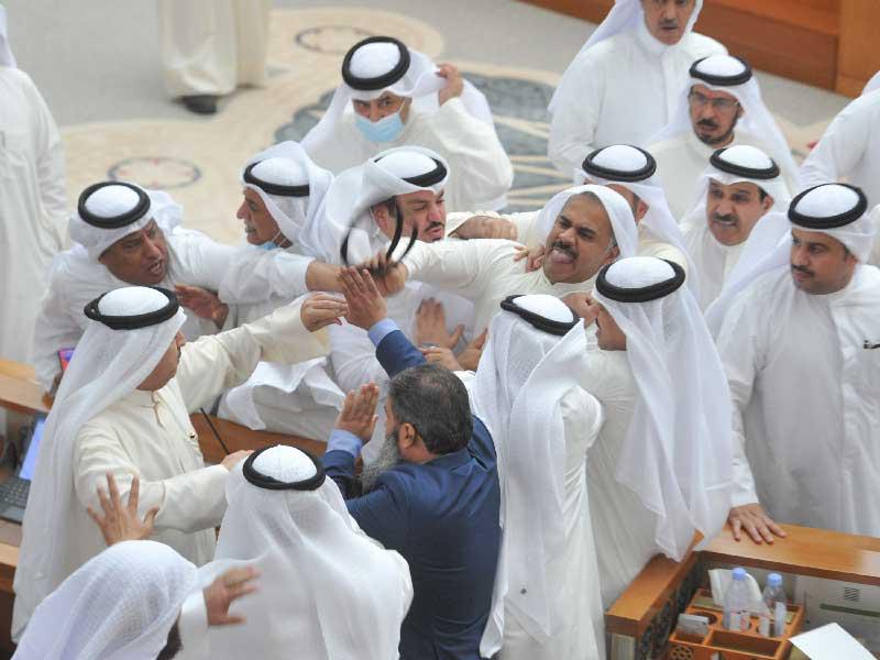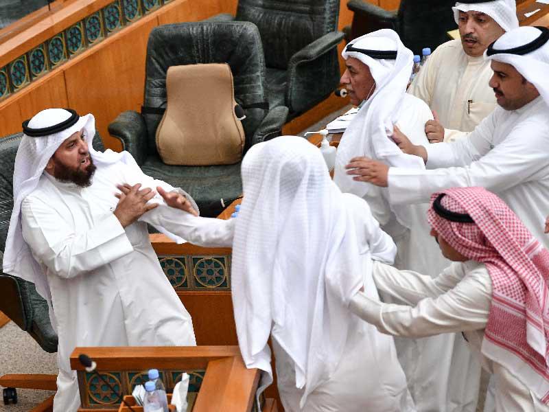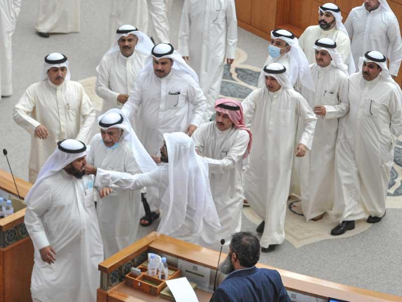 في وقت كان يتجه مجلس الامة للتصويت على تعزيز المصروفات والميزانية العامة للدولة، حدث سجال كبير في القاعة، على اثر اعتراض النواب في كتلة الـ 31 على عقد الجلسة الخاصة من جهة، والتصويت الذي دعا اليه رئيس المجلس وانتهى بالموافقة على عقد الجلسة في ظل عدم تصويت نواب من جانب، أو رفضهم من الجانب الآخر، ليعلن الرئيس مرزوق الغانم موافقة المجلس على الجلسة.السجال الذي حدث بدأت شرارته منذ هجوم النواب على المنصة، في محاولة لإيقاف الامين العام لمجلس الامة عن الاستمرار في التصويت، لكن دون جدوى، حتى اتجه نواب نحو منصة الرئاسة، ليطلب الغانم تدخل حرس المجلس، الذي أخرج النواب من المنصة وقاموا بإنشاء سياج لمنع وصول النواب الى الامين العام.في ذلك الوقت، كان عدد من النواب المعارضين للجلسة يحاولون وقف الامين العام عن التصويت، والغانم يخاطبهم أخرجوهم من المنصة، عندها حدث سجال كلامي بين عبيد الوسمي وحمود مبرك الذي طالب الأمين العام بالاستمرار في التصويت أمام المنصة، ثم انتقل مبرك الى المنطقة المحاذية لمقاعد الوزراء ليتهجم عليه عبيد الوسمي ويمسكه من رقبته، ثم دشداشته فيشقها، ليحدث التشابك بالأيدي، وسط تدخل عدد من النواب منهم ثامر السويط وسعود بوصليب.