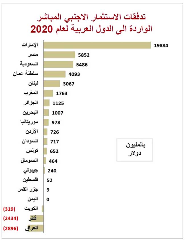 سجلت الكويت تدفقات سلبية في مؤشر تدفقات الاستثمار الأجنبي للدول العربية لعام 2020، إذ خرج صافي استثمارات قيمتها 319 مليون دولار مقابل تدفقات ايجابية بلغت 104 ملايين دولار لعام 2019 بنسبة 405 بالمئة متشاركة في التدفقات السلبية مع البحرين التي تراجعت بـ 32 في المئة وقطر، التي تحسنت عن عام 2019 بـ 13 بالمئة، لكنها لا تزال تسجل تدفقات سلبية للاستثمار الأجنبي في حين سجلت دول خليجية أخرى تدفقات إيجابية مثل السعودية بنسبة 20.2 في المئة والإمارات بنسبة 11.2 بالمئة، وسلطنة عمان 19.7 بالمئة. وكانت المؤسسة العربية لضمان الاستثمار وائتمان الصادرات (ضمان)، قد أصدرت تقريرها السنوي الـ 36 لمناخ الاستثمار في الدول العربية لعام 2021، الذي رصد ارتفاعا غير متوقع في تدفّقات الاستثمار الأجنبي المباشر الواردة إلى الدول العربية بنسبة 2.5 بالمئة، لتبلغ 40.5 مليار دولار عام 2020، ولتمثّل حصتها 6.1 بالمئة من مجمل التدفقات الواردة الى الدول النامية و4 بالمئة من مجمل التدفقات العالمية البالغة نحو 999 مليار دولار.وكشف التقرير عن استمرار التركز الجغرافي للتدفقات الواردة، حيث استحوذت الدول الخمس الأولى على نحو 95 بالمئة من مجمل التدفقات بقيادة الإمارات التي استقطبت 19.9 مليار دولار بحصة تجاوزت 49 بالمئة، تلتها مصر بقيمة 5.9 مليارات دولار وحصة 14.5 بالمئة، ثم السعودية في المرتبة الثالثة بقيمة 5.5 مليارات دولار، وحصة 13.6 بالمئة من الإجمالي العربي، ثم سلطنة عمان في المرتبة الرابعة بقيمة 4.1 مليارات دولار، وحصة 10.1 بالمئة، ثم لبنان في المرتبة الخامسة، بقيمة 3.1 مليارات دولار وحصة 7.6 بالمئة من الإجمالي. كما أشارت بيانات التقرير الى تراجع أرصدة الاستثمار الأجنبي المباشر الواردة إلى الدول العربية بنهاية عام 2020، بمقدار 3.75 مليارات دولار، وبمعدل 0.4 بالمئة من 912.3 مليار دولار عام 2019 الى 908.6 مليارات دولار عام 2020، وذلك وفق بيانات "الأونكتاد"، وذلك إضافة الى استحواذ الدول الثلاث الأولى على نحو 58 بالمئة من مجمل الأرصدة التراكمية الواردة الى المنطقة، حيث استحوذت السعودية على 241.9 مليار دولار بحصة بلغت 26.6 بالمئة، تلتها الإمارات بقيمة 150.9 مليار دولار، وحصة 16.6 بالمئة، ثم مصر بقيمة 132.5 مليار دولار وحصة 14.6 بالمئة.