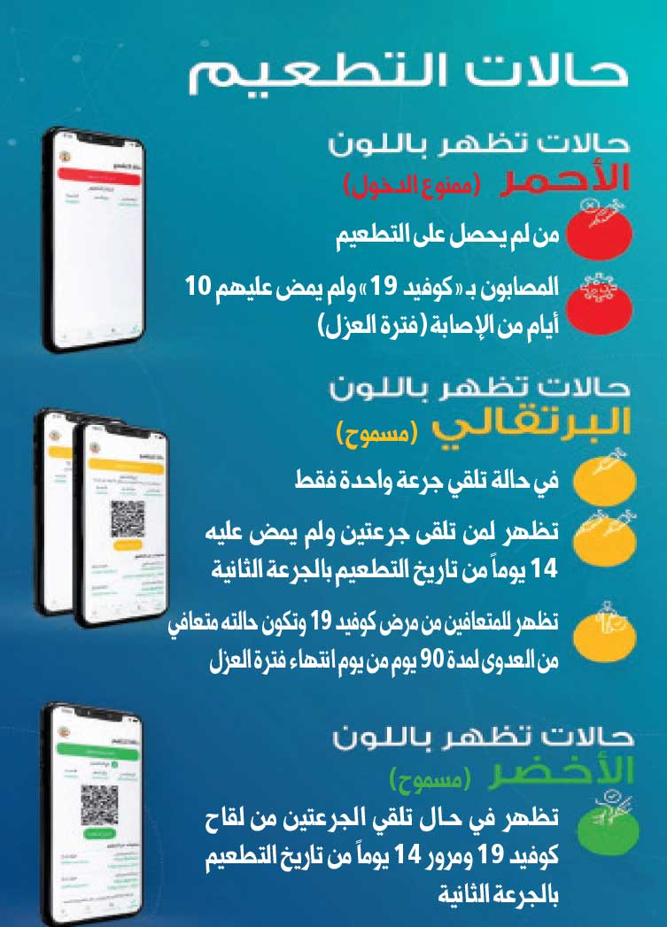 ذكّر مركز التواصل الحكومي ببدء تنفيذ قرار مجلس الوزراء الخاص بحصر دخول المجمعات التجارية والمطاعم والمقاهي والمسارح والسينما والمراكز الثقافية والأندية الصحية والصالونات على المطعّمين ضد «كورونا» اعتباراً من بعد غد الأحد، وفقاً للألوان المبينة في تطبيقَي «مناعة» و«هويتي»، والتي يوضحها «الغراف» التالي: