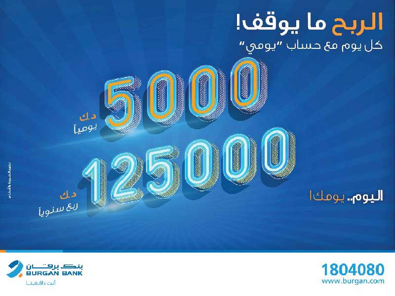 أعلن بنك برقان أسماء الفائزين في السحوبات اليومية على حساب يومي، وفاز كل واحد منهم بجائزة 5000 دينار، والفائزون هم: عالية بنت صالح سحيمي، مأمون عبدالله حسن، سالم حجي الفرحان، جواد ناصر محمد، وسيد رضا موسوي.وإضافة للسحب اليومي، يوفر "برقان" سحبا ربع سنوي لحساب "يومي"، للفوز بجائزة نقدية بقيمة 125.000 دينار. وللتأهل للسحوبات ربع السنوية يتعين على العملاء ألا يقل رصيدهم عن 500 دينار لمدة شهرين كاملين قبل تاريخ السحب، كما أن كل 10 دنانير تمثل فرصة واحدة لدخول السحب. وإذا كان رصيد الحساب 500 دينار وما فوق، فإن صاحبه سيكون مؤهلا لدخول كل السحوبات اليومية وربع السنوية.