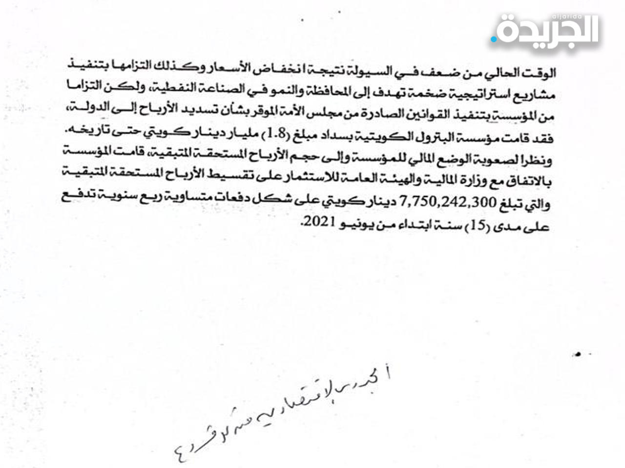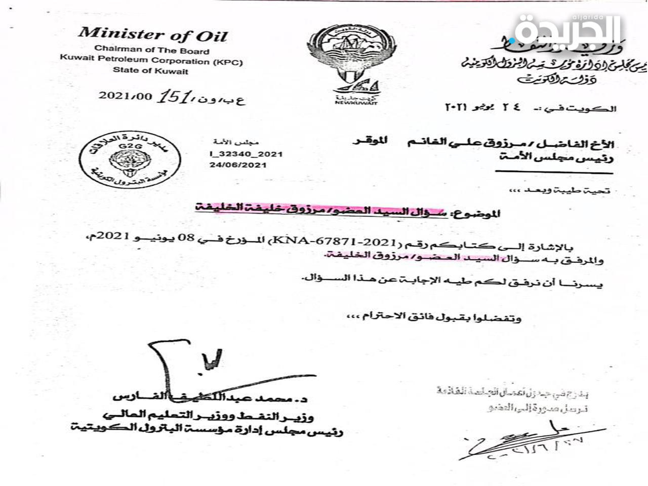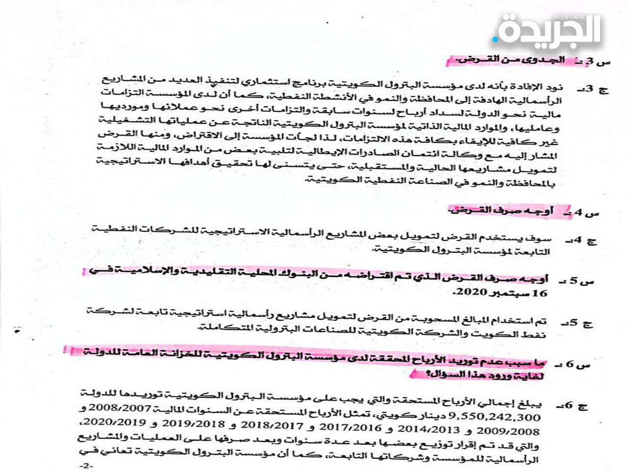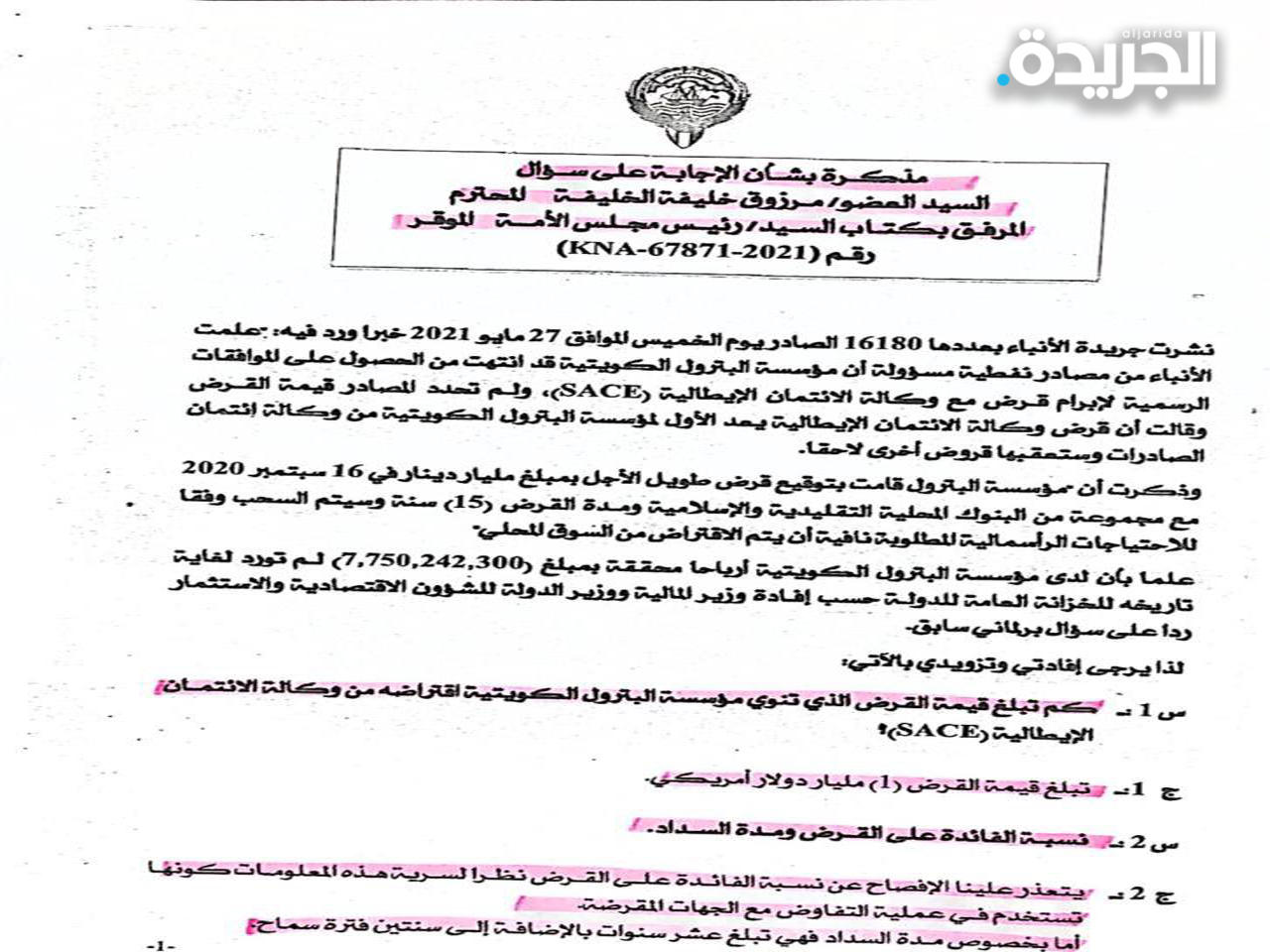 نشرت إحدى الصحف المحلية بعددها 16180 الصادر يوم الخميس الموافق 27 مايو 2021 خبراً ورد فيه: علمت من مصادر نفطية مسؤولة أن مؤسسة البترول الكويتية قد انتهت من الحصول على الموافقات الرسمية لإبرام قرض مع وكالة الائتمان الإيطالية «SACE»، ولم تحدد المصادر قيمة القرض وقالت أن قرض وكالة الائتمان الإيطالية يعد الأول لمؤسسة البترول الكويتية من وكالة إئتمان الصادرات وستعقبها قروض أخرى لاحقاً.وذكرت أن مؤسسة البترول قامت بتوقيع قرض طويل الأجل بمبلغ مليار دينار في 16 سبتمبر 2020 مع مجموعة من البنوك المحلية التقليدية والإسلامية ومدة القرض «15 » سنة وسيتم السحب وفقاً للاحتياجات الرأسمالية المطلوبة، نافية أن يتم الاقتراض من السوق المحلي.علماً بأن لدى مؤسسة البترول الكويتية أرباحاً محققة بمبلغ «7,750,242,300» لم تورد لغاية تاريخه للخزانة العامة للدولة حسب إفادة وزير المالية ووزير الدولة للشؤون الاقتصادية والاستثمار رداً على سؤال برلماني سابق.لذا يرجى إفادتي وتزويدي بالآتي:س 1- كم تبلغ قيمة القرض الذي تنوي مؤسسة البترول الكويتية اقتراضه من وكالة الائتمان الايطالية الإيطالية « SACE»:ج 1: تبلغ قيمة القرض «1» مليار دولار أمريكي. س 2- نسبة الفائدة على القرض ومدة السداد؟ج 2: يتعذر علينا الإفصاح عن نسبة الفائدة على القرض نظراً لسرية هذه المعلومات كونها تستخدم في عملية التفاوض مع الجهات المقرضة، أما بخصوص مدة السداد فهي تبلغ عشر سنوات بالإضافة إلى سنتين فترة سماح.س 3- الجدوى من القرض؟ج 3: نود الإفادة بأنه لدى مؤسسة البترول الكويتية برنامج «اس ماري» لتنفيذ العديد من المشاريع الرأسمالية الهادفة إلى المحافظة والنمو في الأنشطة النفطية، كما أن لدى المؤسسة التزامات مالية نحو الدولة السداد أرباح لسنوات سابقة والتزامات أخرى نحو عملائها ومورديها وعامليها، والموارد المالية الذاتية لمؤسسة البترول الكويتية الناتجة عن عملياتها التشغيلية غير كافية للإيفاء بكافة هذه الالتزامات، لذا لجأت المؤسسة إلى الاقتراض، ومنها القرض المشار إليه مع وكالة انتمان الصادرات الإيطالية لتلبية بعض من الموارد المالية اللازمة لتمويل مشاريعها الحالية والمستقبلية، حتى يتسنى لها تحقيق أهدافها الاستراتيجية بالمحافظة والنمو في الصناعة النفطية الكويتية.س 4- أوجه صرف القرض؟ج 4: سيستخدم القرض لتمويل بعض المشاريع الرأسمالية الاستراتيجية للشركات النفطية التابعة لمؤسسة البترول الكويتية.س 5- أوجه صرف القرض الذي تم اقتراضه من البوك المحلية التقليدية والإسلامية في 16 سبتمبر 2020؟ج 5: تم استخدام المبالغ المسحوبة من القرض لتمويل مشاريع رأسمالية استراتيجية تابعة لشر نفط الكويت والشركة الكويتية للصناعات البترولية المتكاملة.س 6- ما سبب عدم توريد الأرباح المحققة لدى مؤسسة البترول الكويتية للخزانة العامة للدولة لغاية ورود هذا السؤال؟6: يبلغ إجمالي الأرباح المستحقة والتي يجب على مؤسسة البترول الكويتية توريدها للدولة 9,550,242,300 دينار كويتي، تمثل الأرباح المستحقة عن السنوات المالية 2008/2007 و 2009/2008 و 2014/2013 و 2017/2016 و 2018/2017 و 2019,2018 و 2020/2019، والتي قد تم إقرار توزيع بعضها بعد عدة سنوات وبعد صرفها على العمليات والمشاريع الرأسمالية للمؤسسة وشركاتها التابعة، كما أن مؤسسة البترول الكويتية تعاني في الوقت الحالي من ضعف في السيولة نتيجة انخفاض الأسعار وكذلك التزامها بتنفيذ مشاريع استراتيجية ضخمة تهدف إلى المحافظة والنمو في الصناعة النفطية، ولكن التزاماً من المؤسسة بتنفيذ القوانين الصادرة من مجلس الأمة الموقر بشأن تسديد الأرباح إلى الدولة فقد قامت مؤسسة البترول الكويتية بسداد مبلغ «1.8» مليار دينار كويتي حتى تاريخه.ونظراً لصعوبة الوضع المالي للمؤسسة وإلى حجم الأرباح المستحقة المتبقية، قامت المؤسسة بالاتفاق مع وزارة المالية والهيئة العامة للاستثمار على تقسيط الأرباح المستحقة المتبقية والتي تبلغ 7,750,242,300 دينار كويتي على شكل دفعات متساوية ربع سنوية تدفع عل