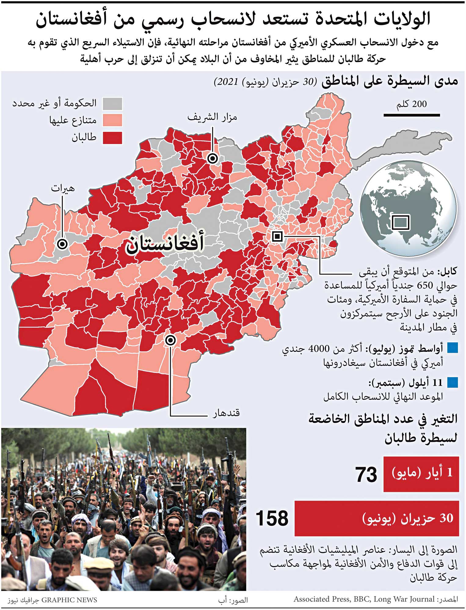 الأنباء عن نية واشنطن إبقاء ألف جندي أميركي في كابول، جاءت غداة تحذير الجنرال الأميركي الكبير أوستن ميلر، وهو القائد الأعلى للقوات الأميركية في أفغانستان، بشن ضربات جوية ضد طالبان إذا واصلت هجماتها للسيطرة على مناطق جديدة، مصراً على أن الجيش الأميركي ما زالت لديه القوة النارية لشن ضربات جوية ضد المسلحين حتى وهو يواصل الانسحاب.ميلر الذي يوشك على تسليم منصبه الى جنرال آخر، حذر في مقال في «نيويورك تايمز» من أن تفاقم العنف قد يؤدي إلى حرب أهلية، وهو سيناريو توقعته أيضاً روسيا قبل أيام.ويشكك المسؤولون الحكوميون الأفغان في تأكيد «طالبان» الاستيلاء على مناطق جديدة فيما يصعب التحقق من ذلك بشكل مستقل.لكن الخبراء يقولون إن أحد الأسباب الرئيسية التي جعلت طالبان قادرة على السيطرة على عشرات المناطق الجديدة في الأسابيع الأخيرة هو افتقار القوات البرية الأفغانية التي تقاتل في مناطق ريفية الى الدعم الجوي الأميركي.