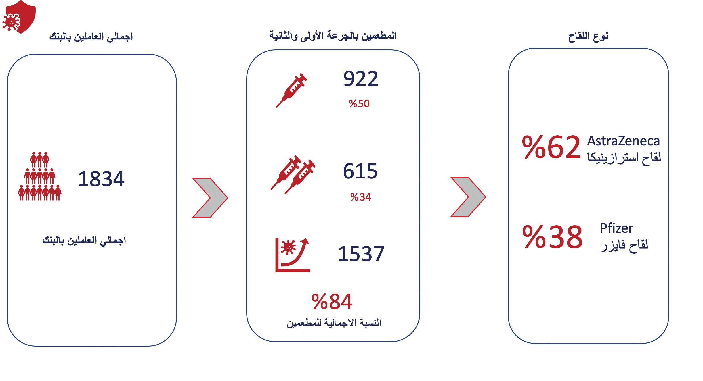 أعلن بنك الخليج وصوله إلى نسبة تطعيم تبلغ 84 في المئة ضد فيروس كورونا، بين جميع موظفي البنك العاملين في مختلف الفروع، والذين يبلغ عددهم 1834 موظفا، ووصل بنك الخليج إلى هذه النسبة بعد اختتام حملة التطعيم التي أطلقها بالتعاون مع وزارة الصحة، حرصا على صحة وسلامة العاملين في البنك وأسرهم والمتعاملين معهم. وتم خلال الحملة، التي انطلقت من 8 إلى 11 صباح الأحد الماضي، تطعيم جميع موظفي بنك الخليج المسجلين للتطعيم، والبالغ عددهم 220 موظفا، في مركز التدريب التابع للبنك، والذي يقع في الدور 34 في برج كريستال بمدينة الكويت، وبذلك أصبح اليوم 922 موظفا حاصلا على الجرعة الأولى من اللقاح، بينما استكمل 615 موظفا تطعيمه بالجرعتين، من لقاحي فايزر، وأكسفورد.بدورها، قالت المديرة العامة للموارد البشرية في بنك الخليج سلمى الحجاج: "موظفونا هم حجر الأساس الذي ترتكز عليه جميع أعمالنا. في ظل التحديات الصحية التي يعيشها العالم أجمع، ومع توفر اللقاحات المضادة لفيروس كورونا في الكويت، كان لزاما علينا أن نسعى لتحصين موظفينا وضمان سلامتهم وسلامة أسرهم وسلامة عملائنا أيضا".